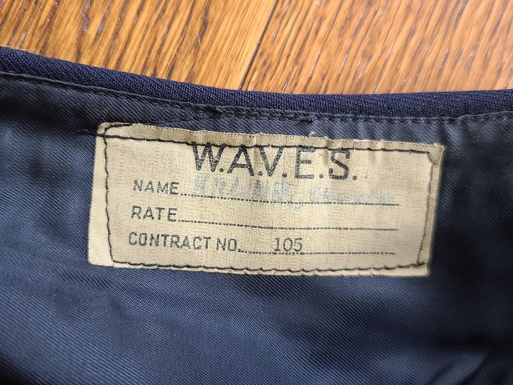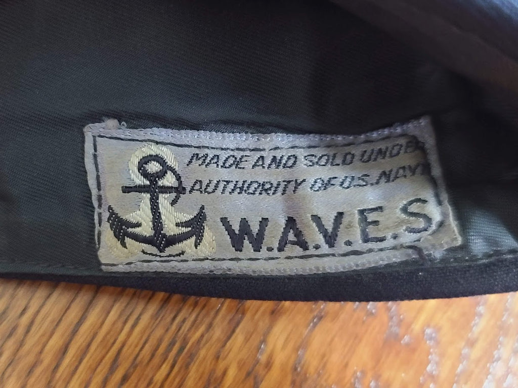 Vintage WWII women's US Navy WAVES garrison cap. The hat does not have a size, but it seems to be rather large, measuring to about a 23 1/2. It is in good condition overall. There is a small pull in the material in the front. It does have a name written on the tag, but it is illegible. Light staining on the inside. - ← Previous Product Next Product →