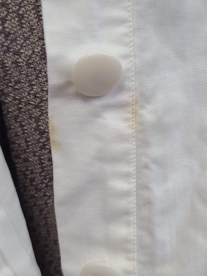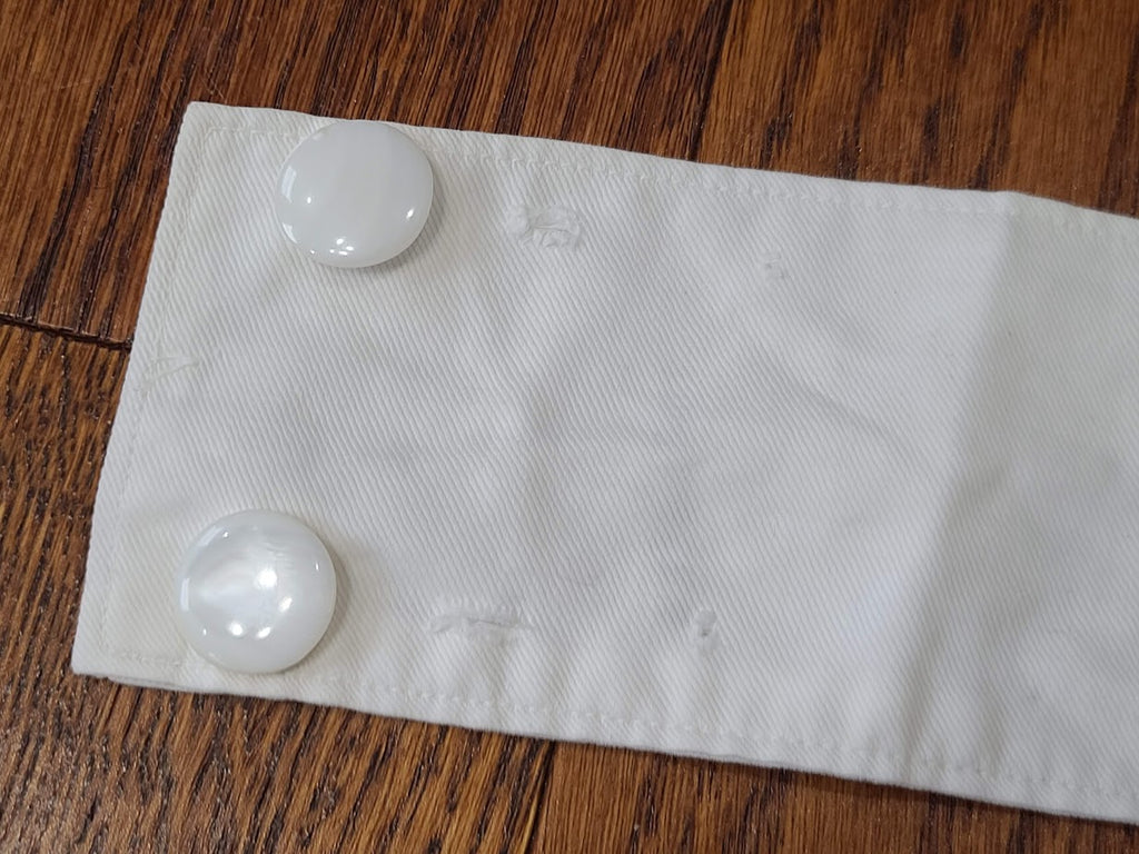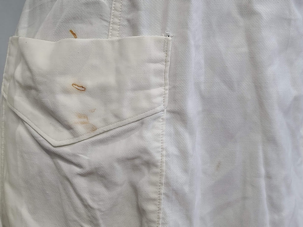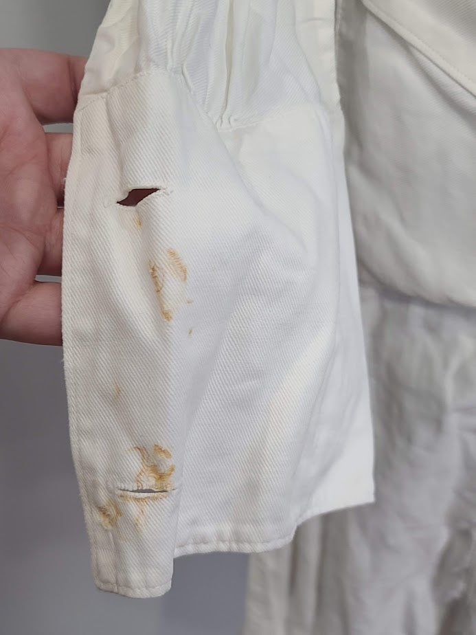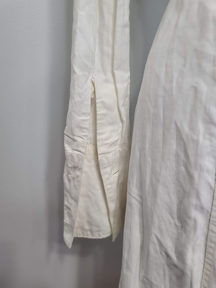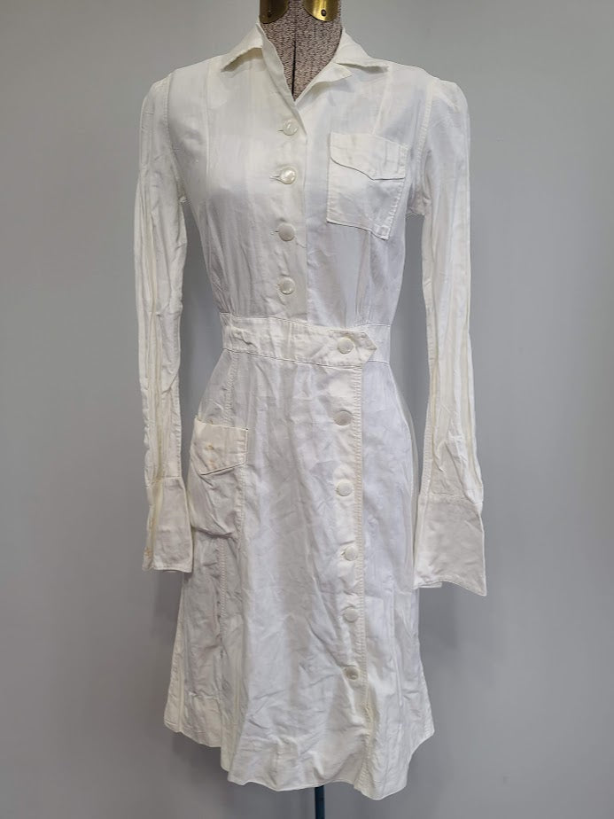 Length - 38 3/4"Nice Navy Nurse Uniform label at the neck. Named to Frances Tomasela. Overall decent condition, with some issues. The buttons are held in place by cotter pins. The buttonholes have some wear. Some wear and fraying on the collar. There are some (rust?) stains on the waist pocket and the edges of the waist and bust pocket have small tears. One cuff also has (rust?) stains. The belt has some small holes and pulls in the material. Some staining by a button that is hidden when worn. A few spots and pulls in the material. Part of the hem has come unstitched, The hem is 3" so it could be let down a bit if needed. The cuffs should have cufflinks which are not included.