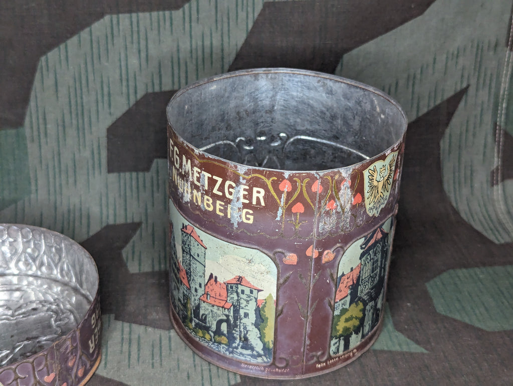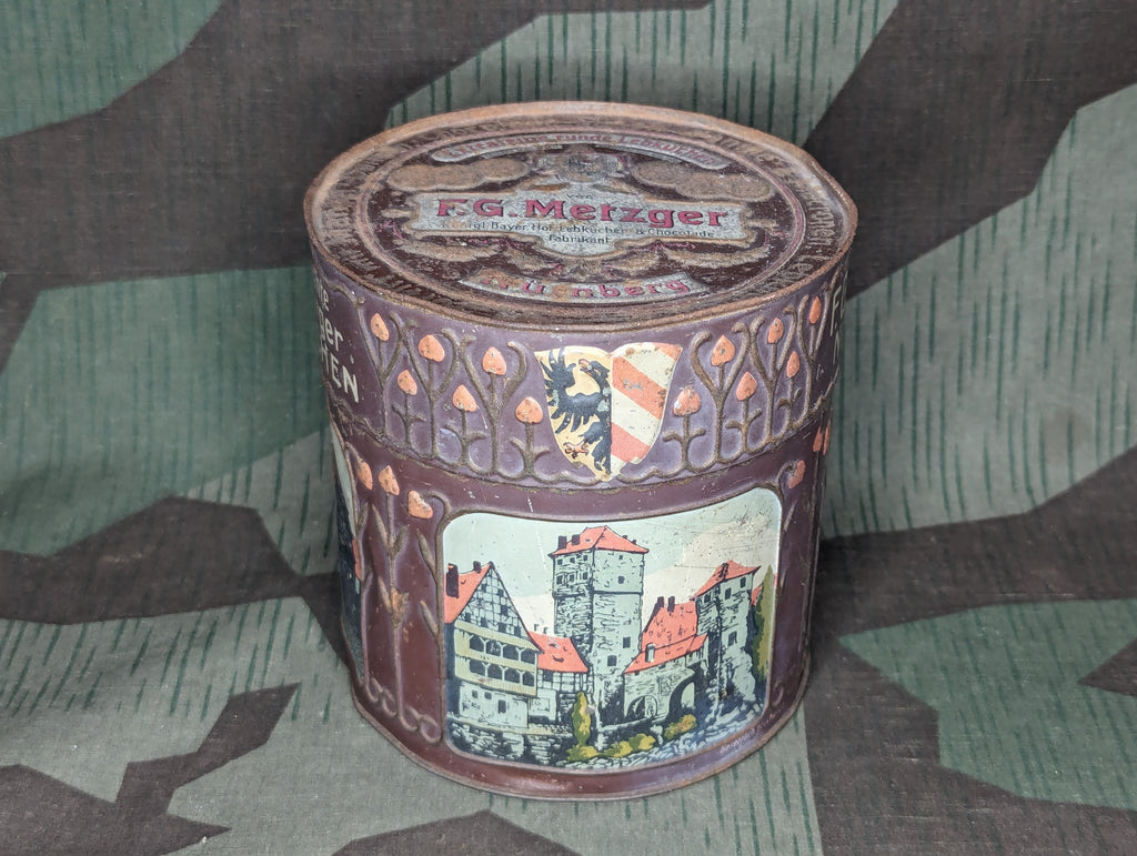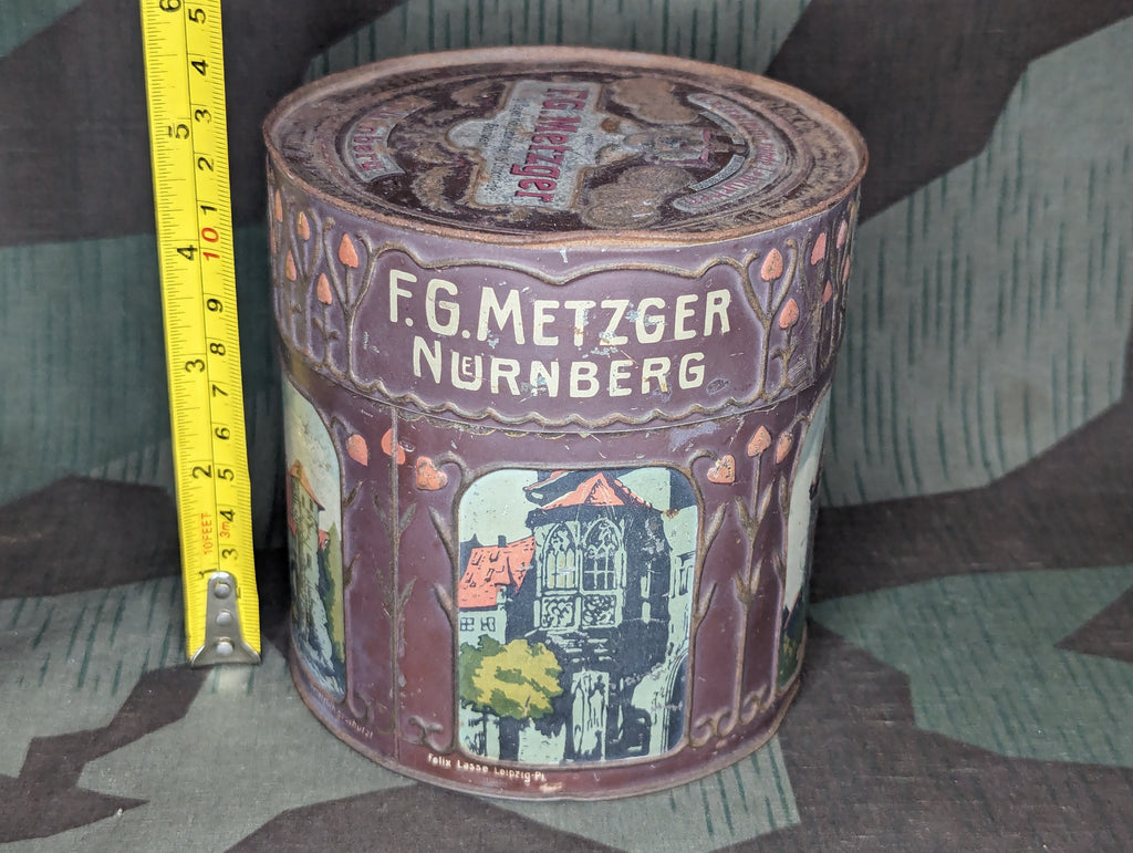 Very old example of a lebkuchen tin from F.G. Metzger in Nürnberg, I would say it is likely from the very early 1900's, pre WWI. It has some wear, but still rather nice for its age. The bottom is marked Kgl. - an abbreviation of Königlich, signifying royal ownership. Surprisingly, the bottom of the tin is very good and very well decorated which is extremely unusual for these tins. The newest award mentioned on the bottom is from 1906. Lebkuchen are a type of cookie, popular in Nürnberg and also popular around Christmas.
