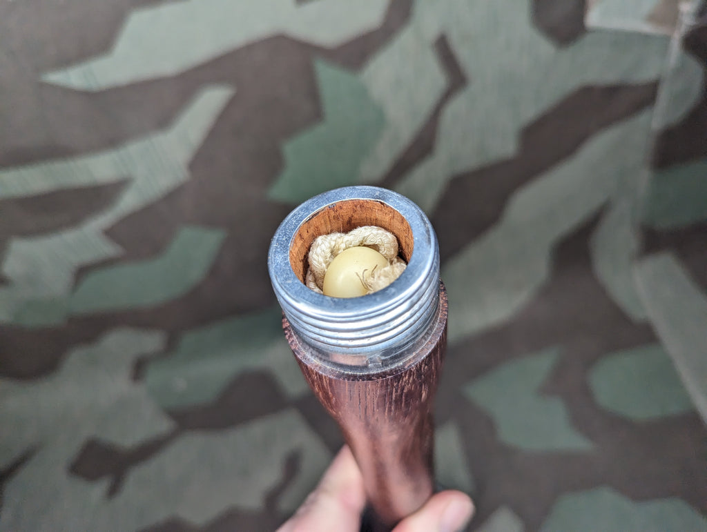 Nice older G-Max reproduction stick grenade display. Still one of the best metal reproductions ever made - way ahead of most of the current production versions. The inside of the head is a little rusty. It is complete with the pull ball, cord, and fuse with blasting cap. - ← Previous Product Next Product →
