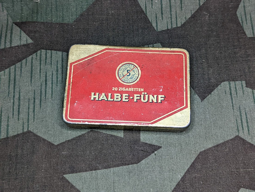 Original 1930's Halbe-Fünf 20 cigarette tin in decent condition. There is some wear, but it is still a nice tin overall. The front has a coin logo that says "Deutsches Reich 5 Reichspfennig." - ← Previous Product Next Product →