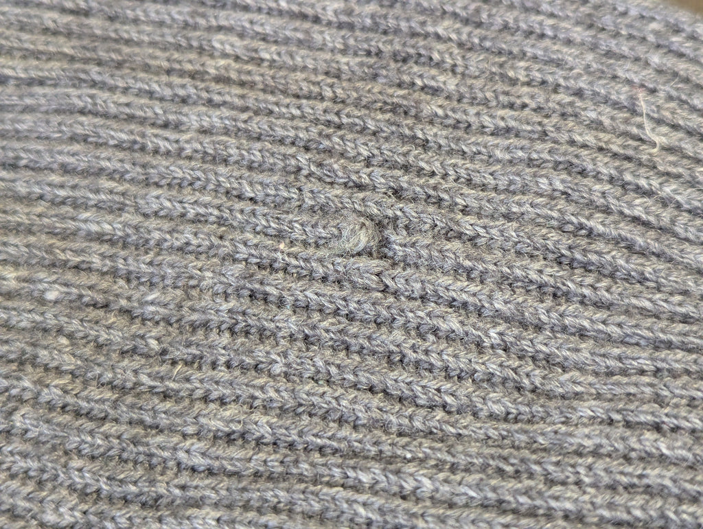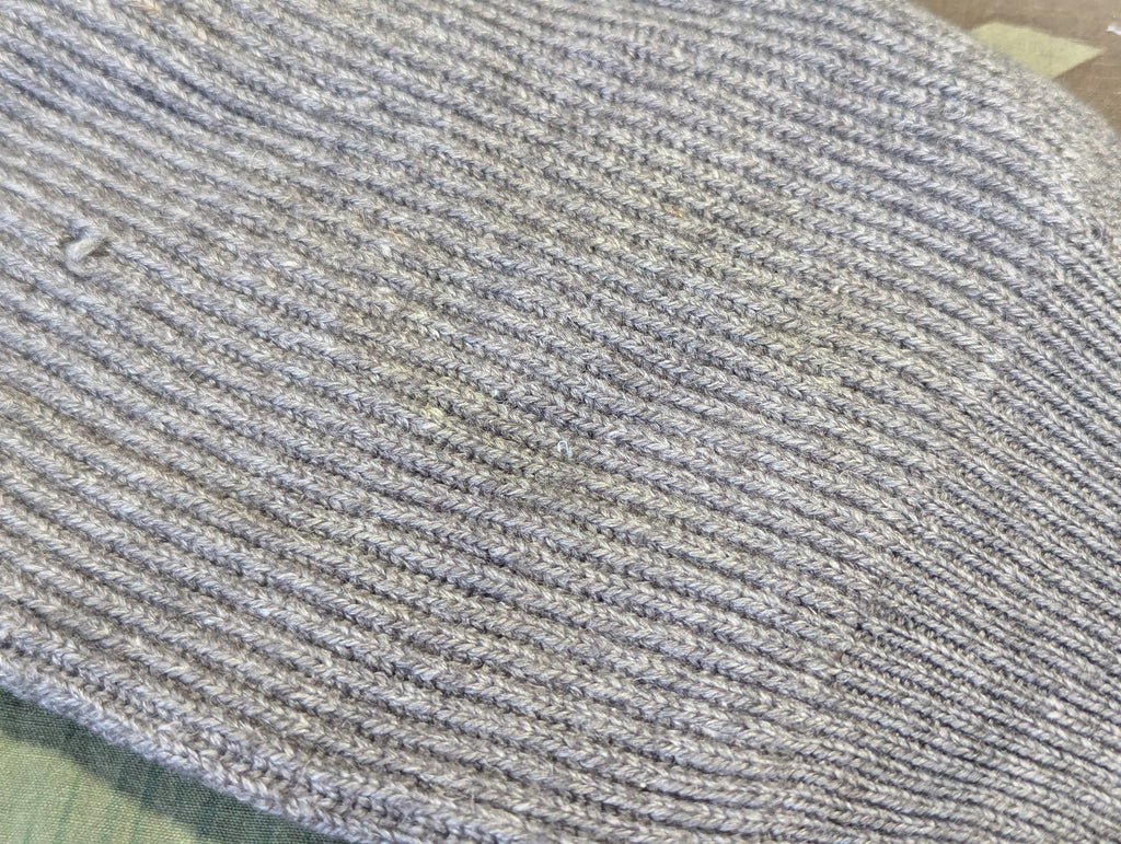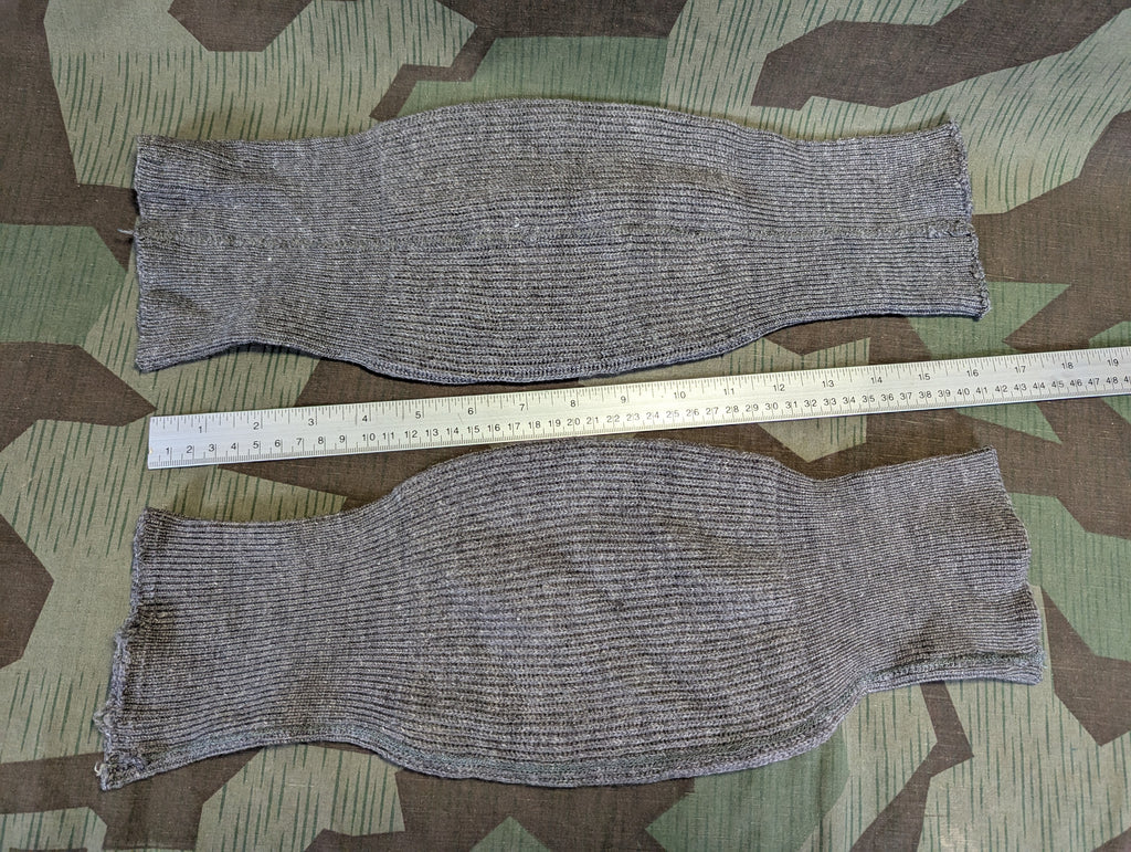 Original machine knit gray wool knee warmers. One of the lesser known winter accessories that were fairly common in the Wehrmacht. In good condition with a few tiny holes and some minor staining from years of storage.