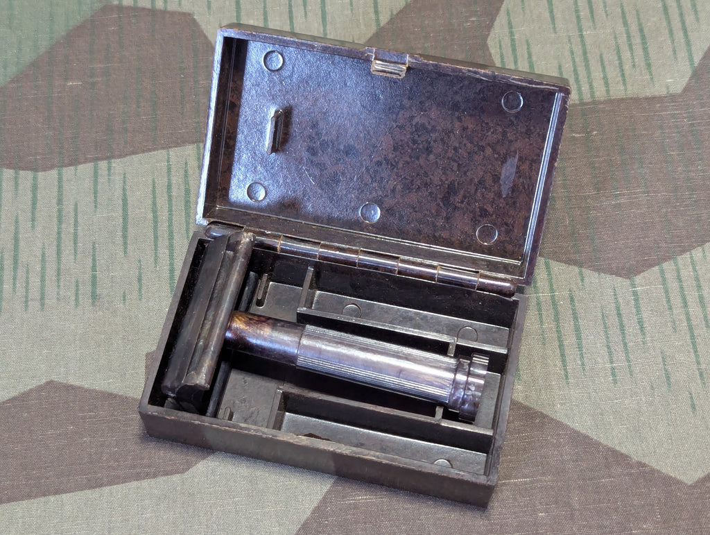 Original German plastic razor in the original Bakelite box. The plastic this is made from is a little unusual as it is somewhat swirly and transparent. In good condition.