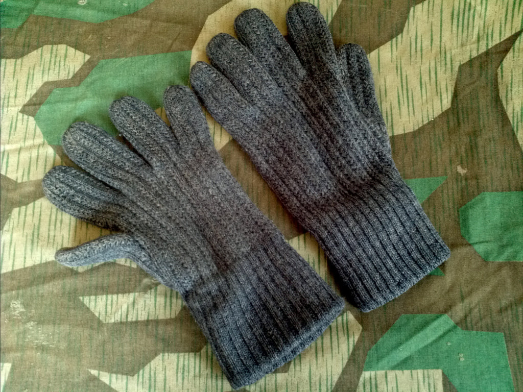 The story of these is very interesting. They were recovered from a repair shop that would get the gloves, socks, etc... collected from the soldiers at the end of the winter to repair them and reissue them next winter. They are not a perfectly matched set, as the nature of collecting thousands of pairs of gloves for repair and reissuing meant that the only concern was that the glove was fixed when it went back to the front and not that it was still with its original mate. These are well used and repaired. For those of you that like to have original stuff this is your chance. They are usable as is, already repaired, they just haven't made it back to the front yet.