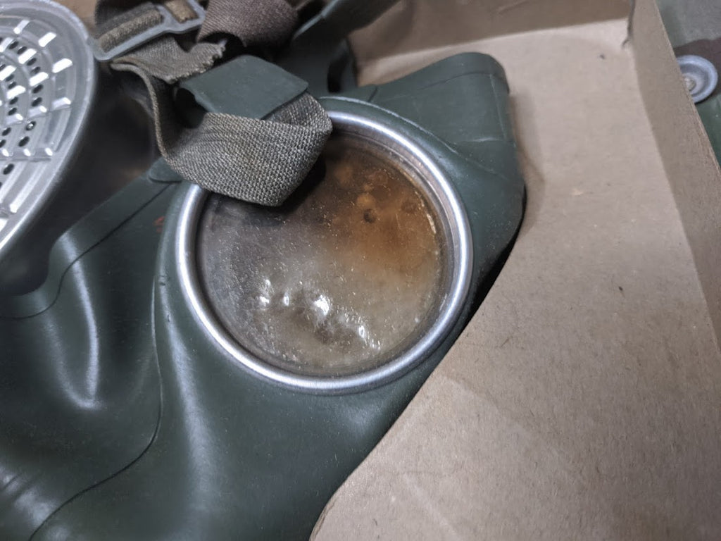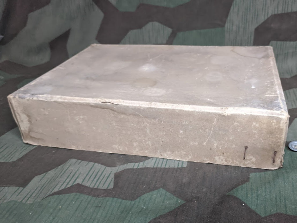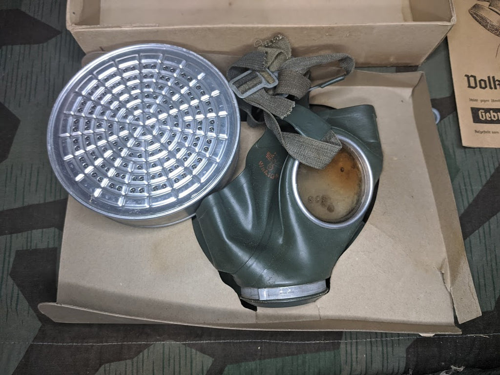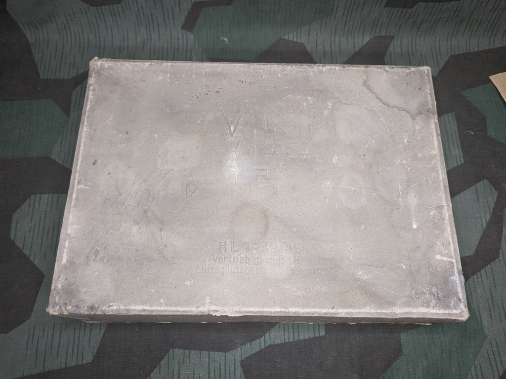 Original unused VM40 Volksgasmaske 40 civilian luftschutz gas mask. It is in its original cardboard box with its original manual and even still has the little paper protector over the nose vent. The cardboard box is a little tattered and dirty. The mask is in like new condition except for some degradation and darkening to the lenses. Every German citizen was required by law to own a gas mask and emergency medical supplies in case of air raids and this is one of them. - ← Previous Product Next Product →