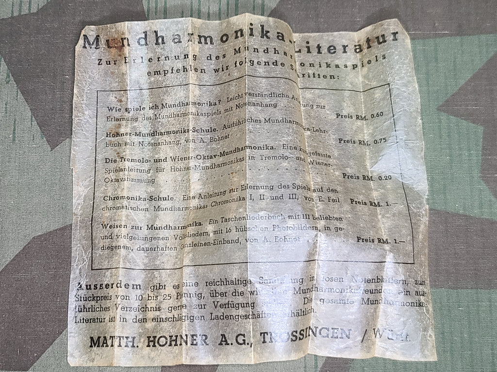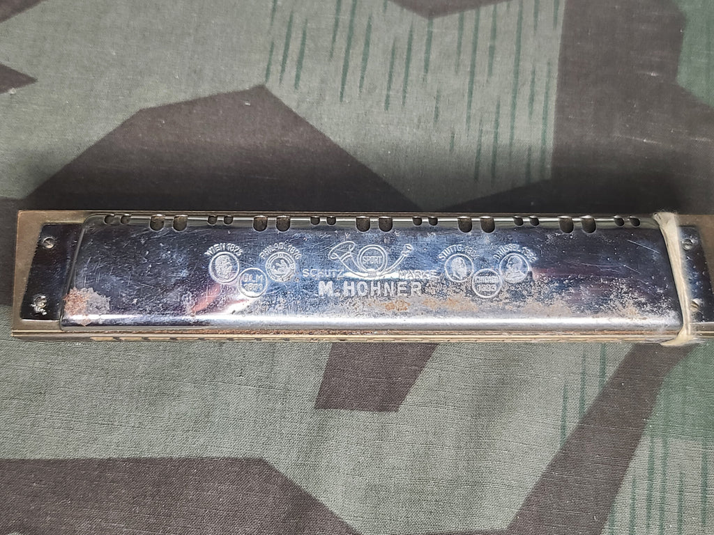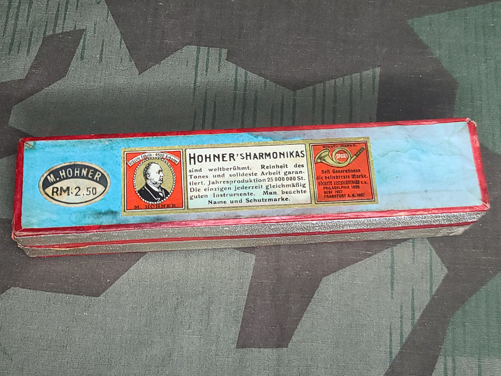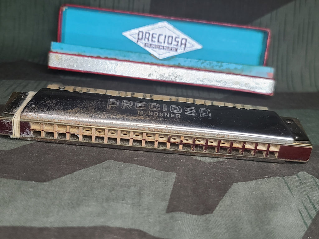 Original German Preciosa M. Hohner harmonica in chord D. The harmonica is in its original box. The box is priced at RM 2.50 (reichsmarks). The harmonica has some storage wear and light rust and the box has some water damage and color bleed. There is a thin advertising paper inside for books. Needs cleaned up a bit.