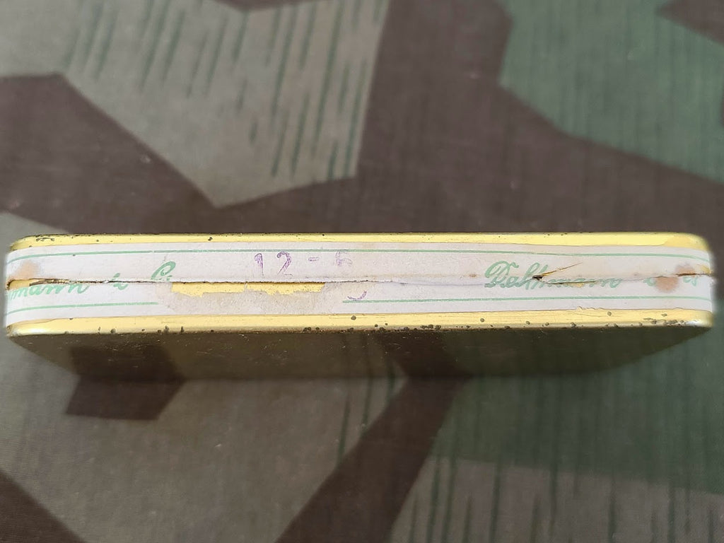 Postwar Kola Dallmann energy tablet tin. The inside text translates to "Eat it like you would a piece of chocolate! A comfortable dose is 1-2 tablets." Wachhaltmittel (means of staying awake). It will keep you awake when your body wants to be sleeping, like a 5 hour energy or scho-ka-kola. The tin is in fairly good condition with some wear around the edges and small rust spots.