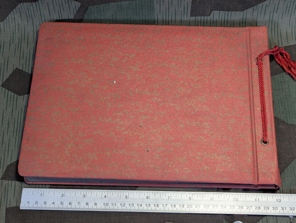 Vintage period German deadstock unused photo album. Red with a gold color texture print. Typical spiderweb sheets between pages to protect photos. Overall good condition with some light wear. A few specks on the cover.