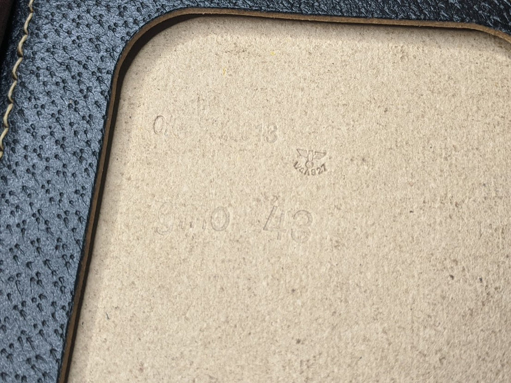 Finally, a true reproduction pressstoff straight shovel carrier. These are so good, they are basically brand new originals, as if the original factory just came back online. Extremely nice and accurate reproduction Preßstoff material, sewn together with natural linen thread with good quality leather. There were several variations of pressstoff, this is my personal favorite as I have seen a great deal more of it than some of the other finishes. All are marked gmo 43 with a waffen amt and also an R.B.Nr. as this was a frequent occurrence during the adoption of the R.B.Nr. system.
