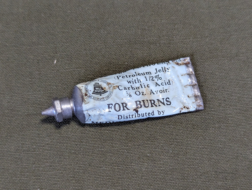 Vintage WWII small tube of petroleum jelly for burns. Bell System logo. Ok condition, has been used. General wear and dirt. Some of the jelly may have gotten on the tube, so it may be a bit greasy.