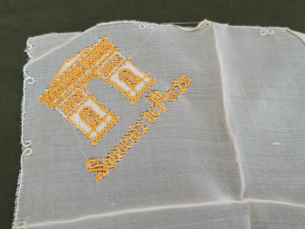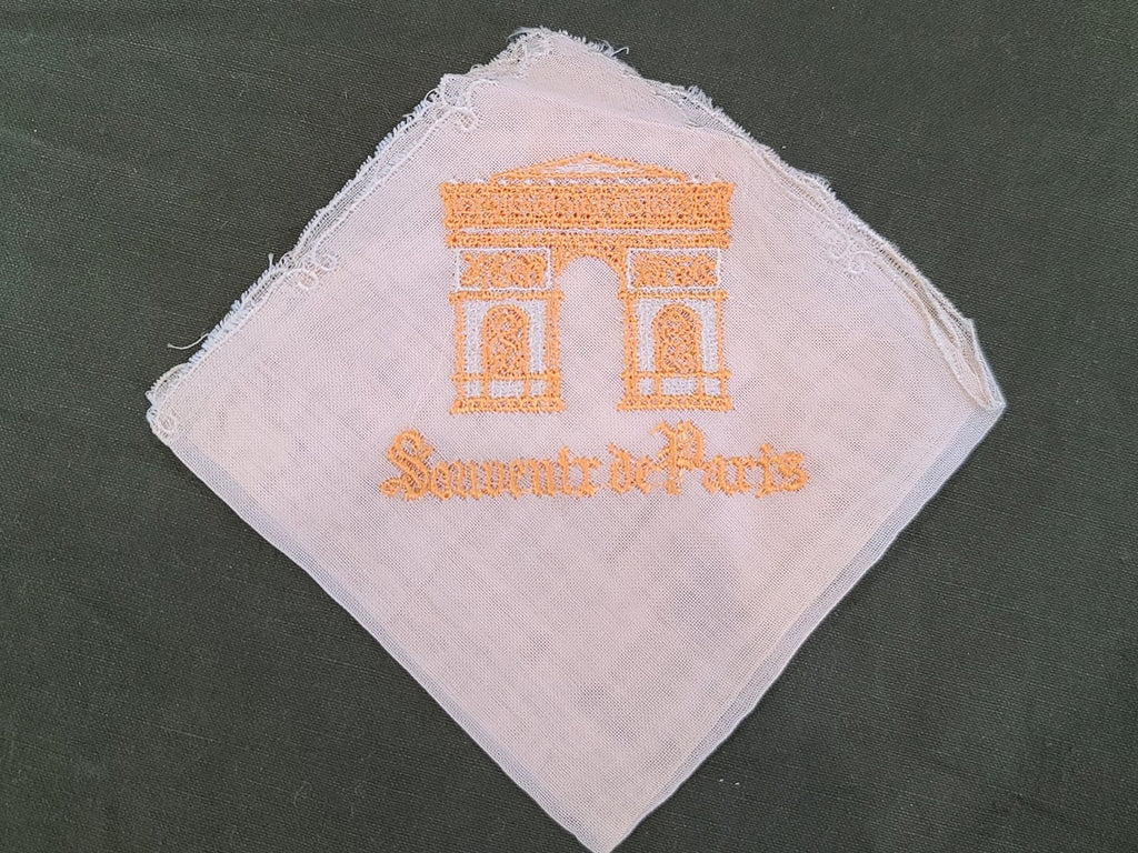 Vintage 1940s Souvenir de Paris hankie with the Arc de Triomphe. It is a pale pink color and fairly see-through. There are a few pulls in the material but it is in otherwise good condition. - ← Previous Product Next Product →