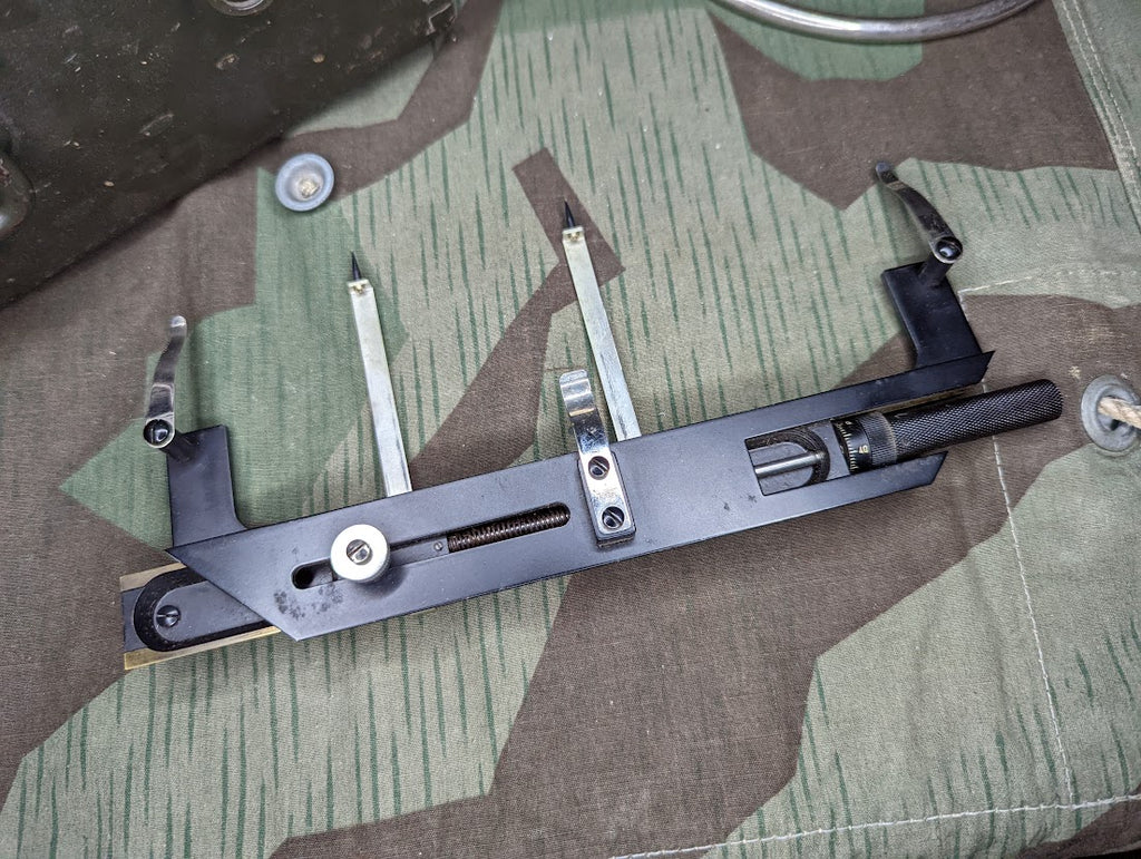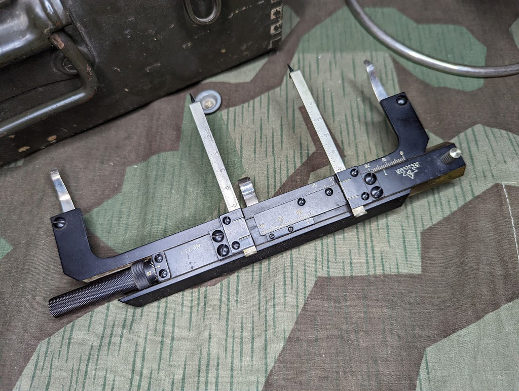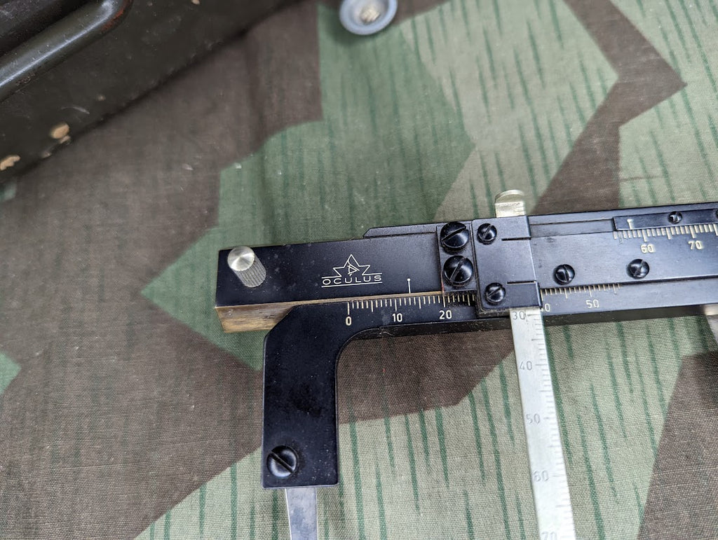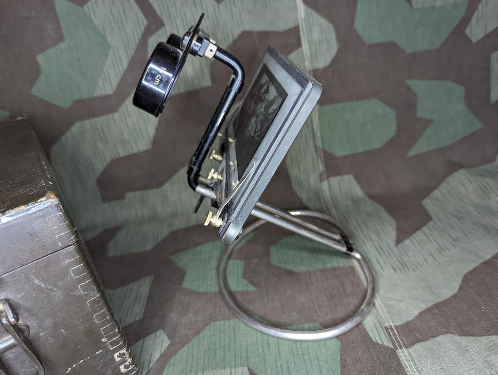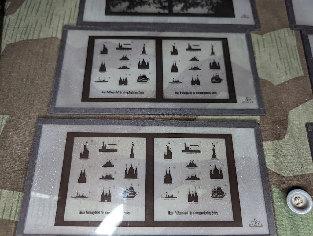 Original German 3D image viewer which I believe was used to train people for reviewing aerial reconnaissance pictures. Made by Oculus. This is probably the most bulky stereoscope set up that I have seen and it also has a very precise little adjustable comparison tool. It comes with 7 different slides, some are of landscapes and some are calibration slides. It all packs up nicely in its original wooden box. The box is marked on the side with a waffen amt and the Oculus company logo. - ← Previous Product Next Product →
