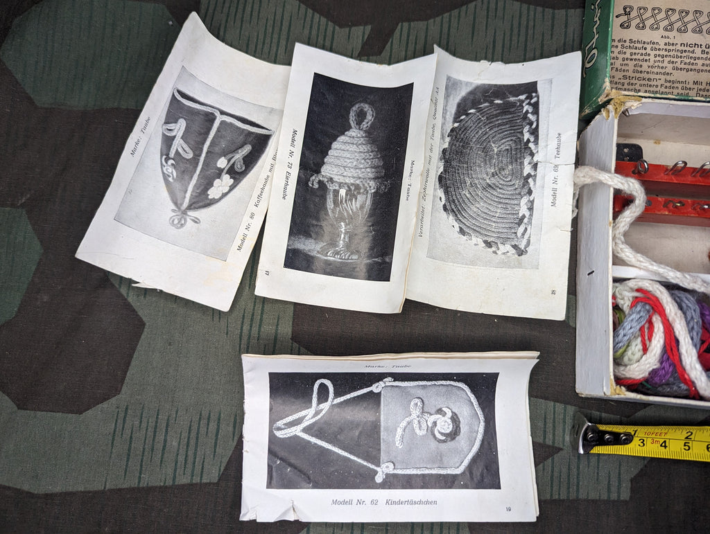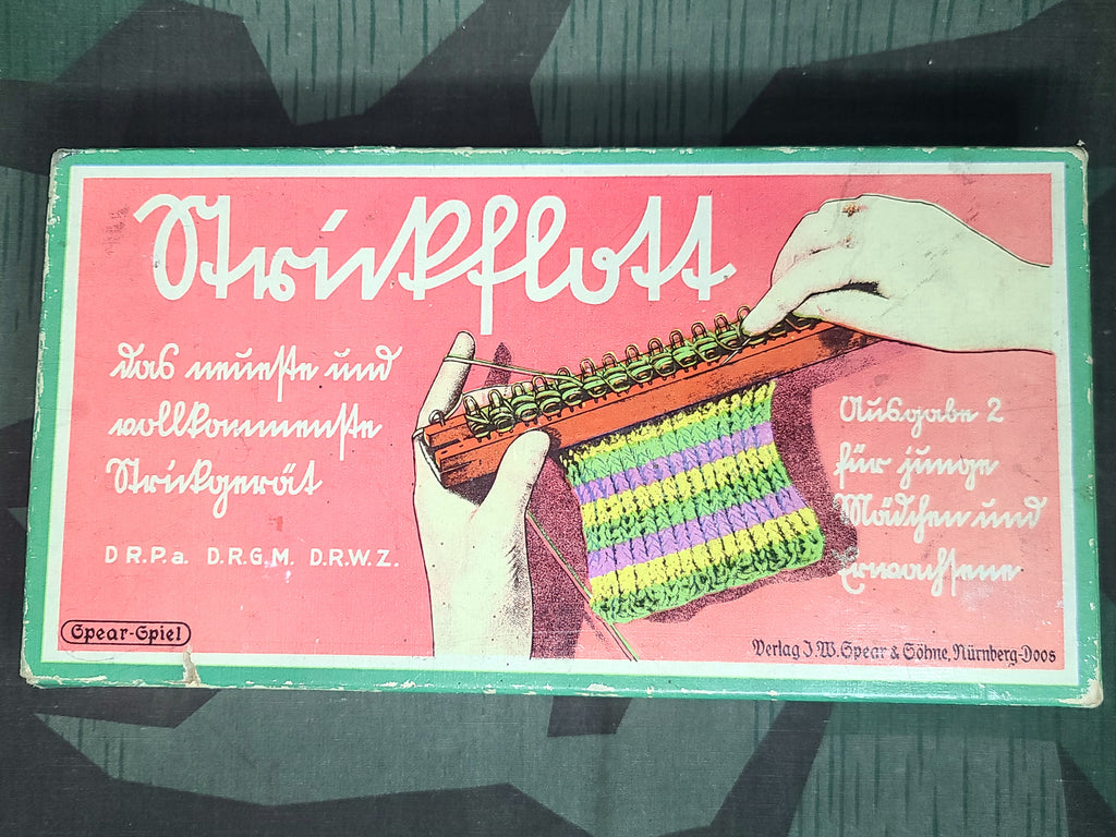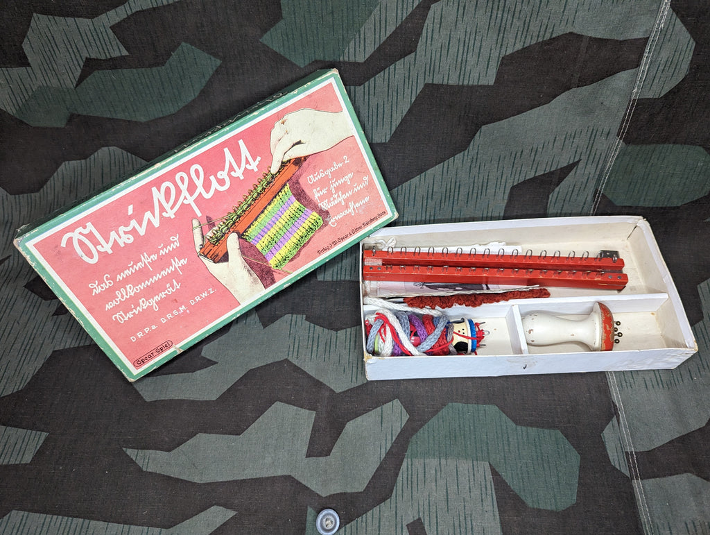 Original German Strickflott civilian knitting device in the box with some other bits. D.R.P.a. marked. It is in OK condition and has been used before. The box shows wear and the items don't fit very well. The paper instructions are torn and some pages may be missing. - ← Previous Product Next Product →