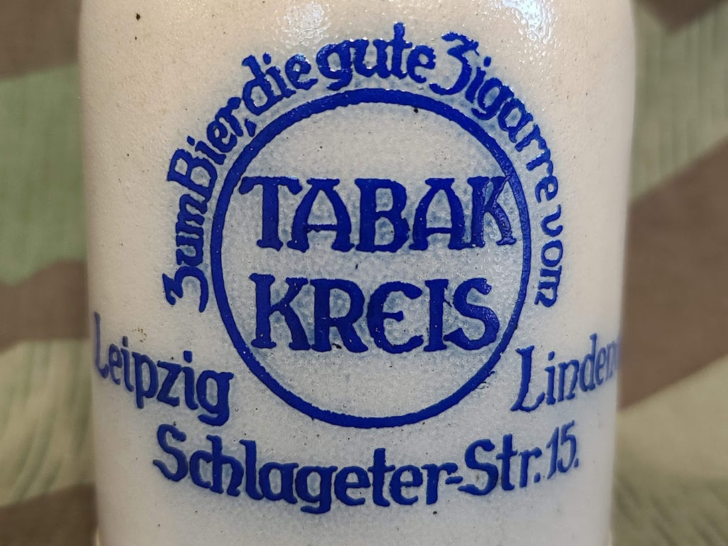 Vintage Tabak Kreis 0,5L krug. Zum Bier, die gute Zigarre vom Tabak Kreis. Period appropriate (could be 1940s - 1960s), this stoneware krug has a nice, classic look. Decent, useable condition. There is a slight hairline crack near and on the handle (still holding up well). The rim shows some wear. Great for events instead of farby bottles.