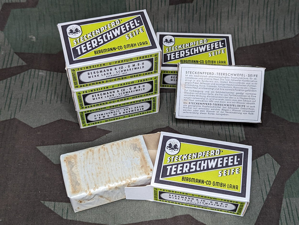 German soap in box. This is deadstock in fairly good condition - just some storage wear, maybe some crushing to the boxes. As for the age of these, these are post war manufactured but the style of the box is virtually identical to the pre war box. The only marking which helped date these was the city Lahr in Germany which is where the company moved to after the war. Price is for one box of soap.