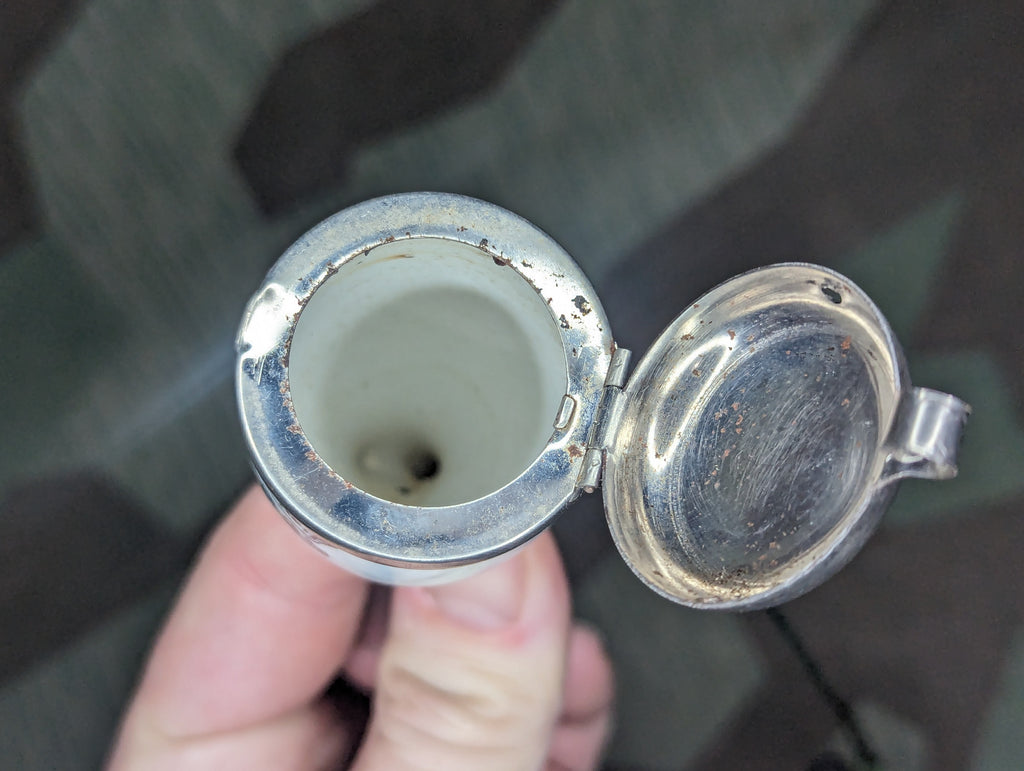 Nice unused example of a reservists smoking pipe. Great traditional German style. It is in nice condition, but I think it might need a tiny bit of work. The wooden stem fits very loosely into the cork for the ceramic elbow, so it might need glued in. Nice pipe with nice soldier graphics. - ← Previous Product Next Product →