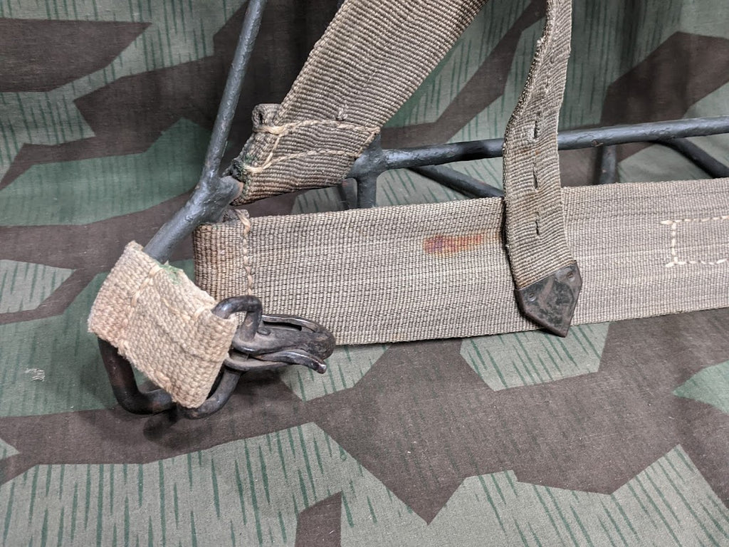 Decent traggestell 43 project, from my own personal project pile. The hard to manufacture webbing pieces are present. The missing webbing is all of the relatively easy stuff to make. As an added bonus, this is one of the traggestell 43's that was made with a mix of captured British webbing which means you could easily use inexpensive and widely available British webbing to create the missing straps and it would be completely accurate and blend with the original webbing.