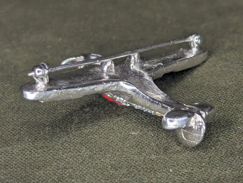 Vintage WWII Alfred Philippe Crown Trifari rhinestone airplane pin. Cute patriotic sweetheart brooch. The red and blue paint has chipped off. A few rhinestones are yellowed and two are missing. Some rhinestones look as though they have been replaced; the rhinestone looks just a little too big.