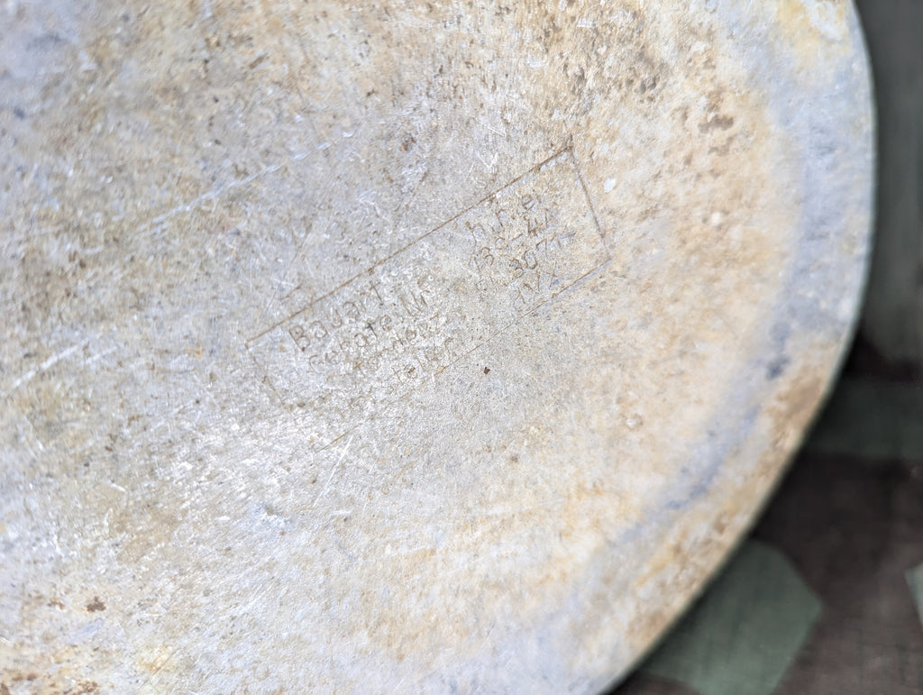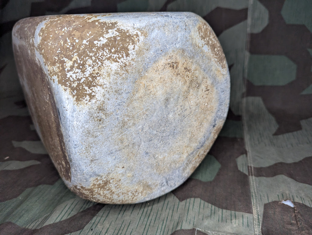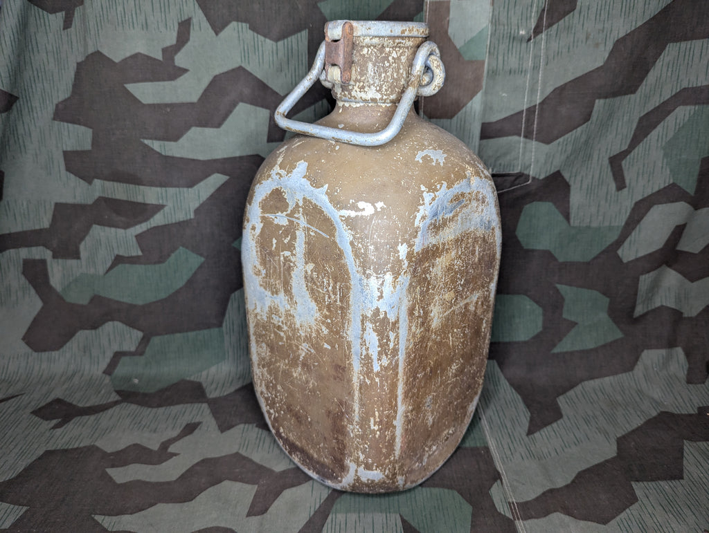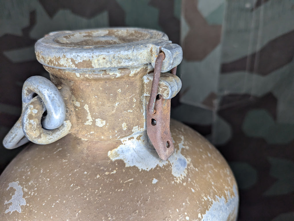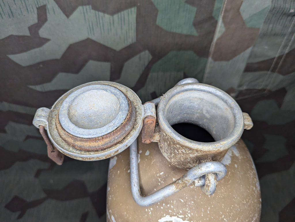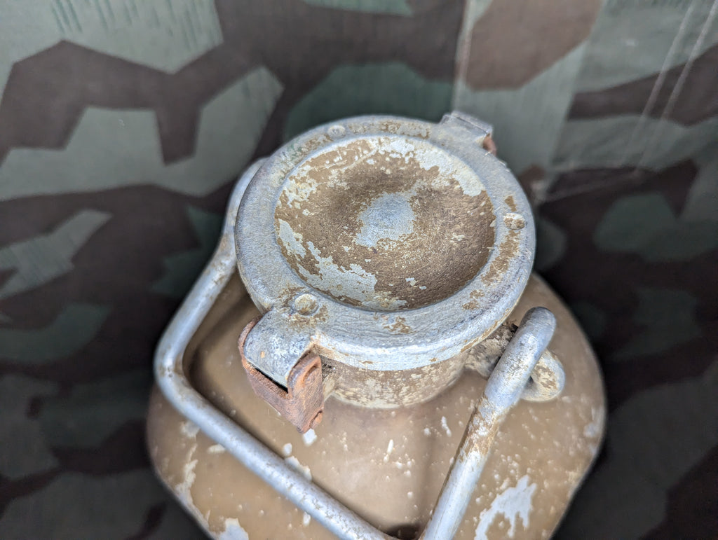 Nice usable 10L Trinkwasser can. It is of the type which doesn't have markings on the lid, just the bottom marking - which is a bit too worn to really make out. It just needs a cleaning. There is a decent amount of the original paint left, enough to use it as is. It would be good to replace the gasket as it is a bit tight and crumbling. We do sell repro replacement gaskets here.