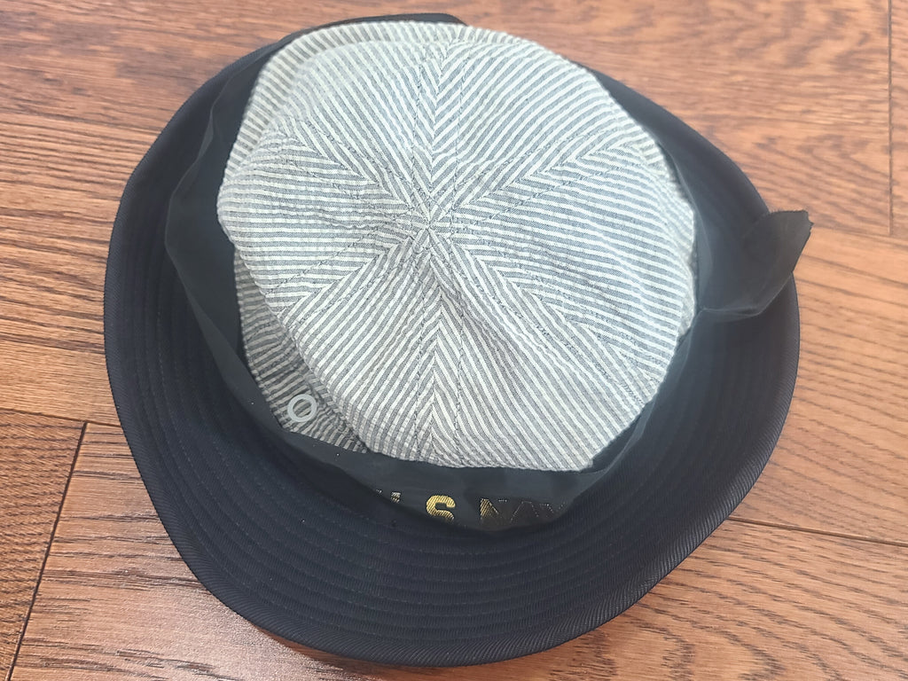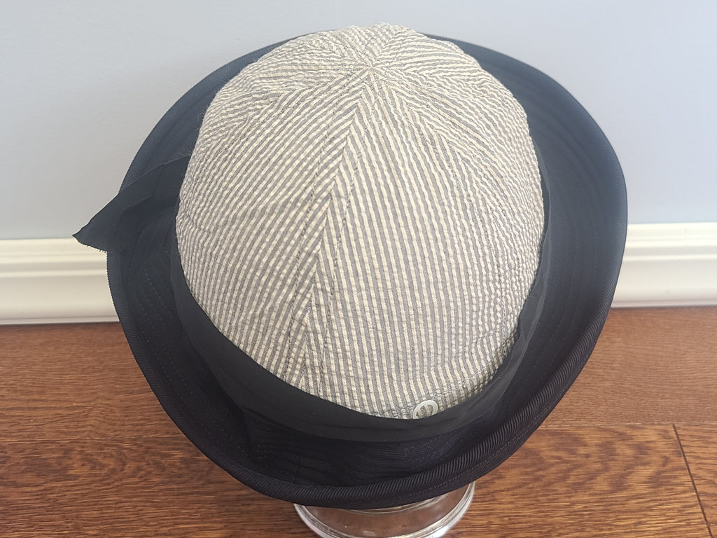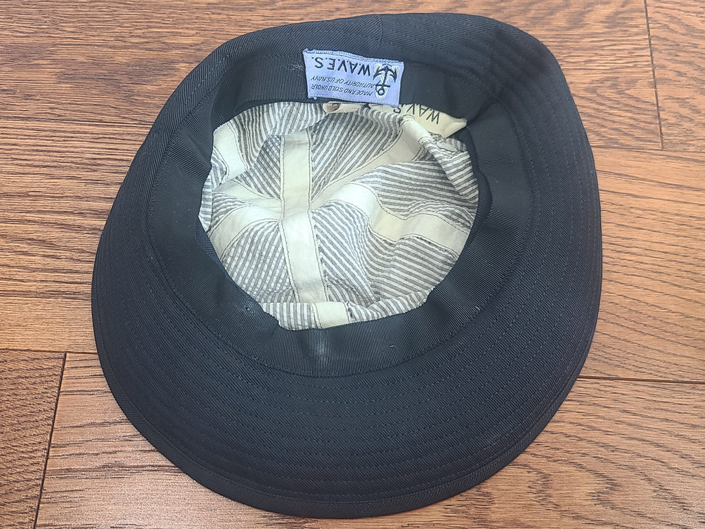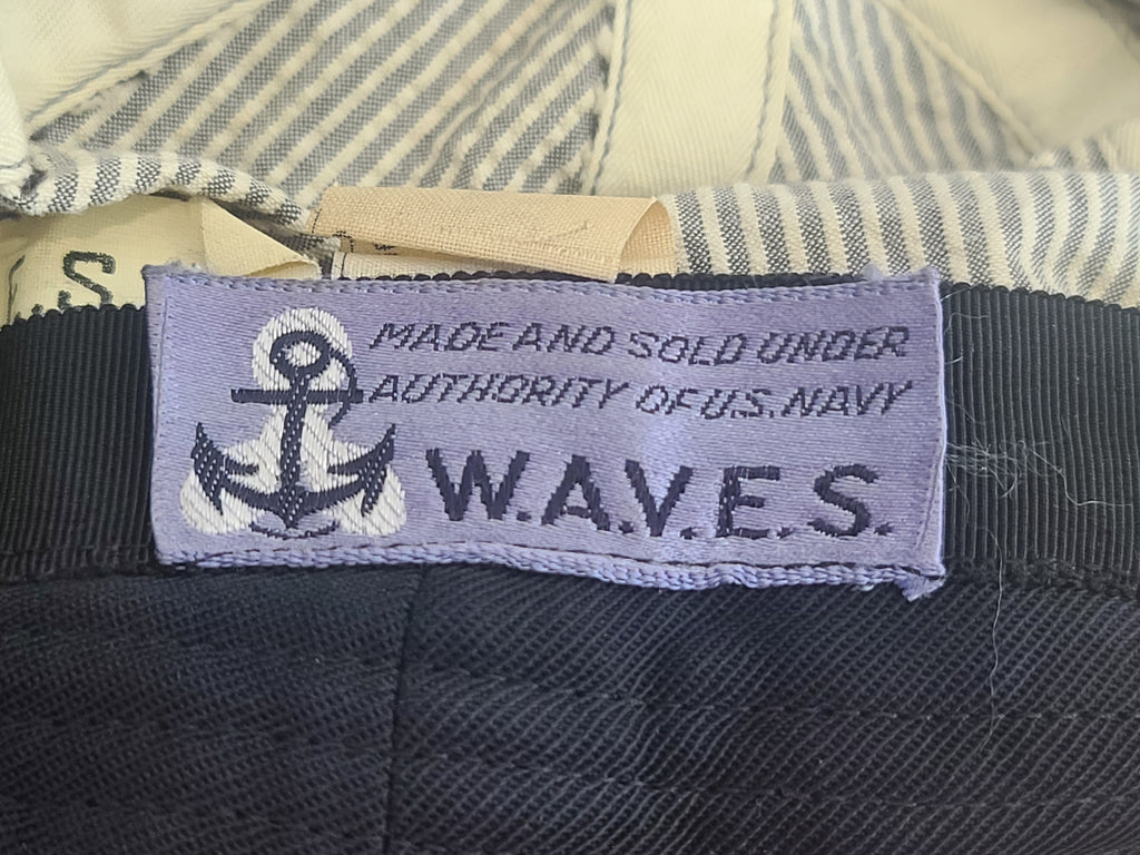 Original vintage WWII US Navy WAVES women's service hat (enlisted). The brim is marked size 22 1/2 and the seersucker cover is marked size 22. The hat itself fits more like a 22 1/2. Overall good condition. Nice labels. The seersucker cover has some staining. The tally is a little wrinkled and has some minor discoloration. The seersucker cover snaps on to the brim and can be changed out for a white or navy blue cover (only the seersucker cover is included).