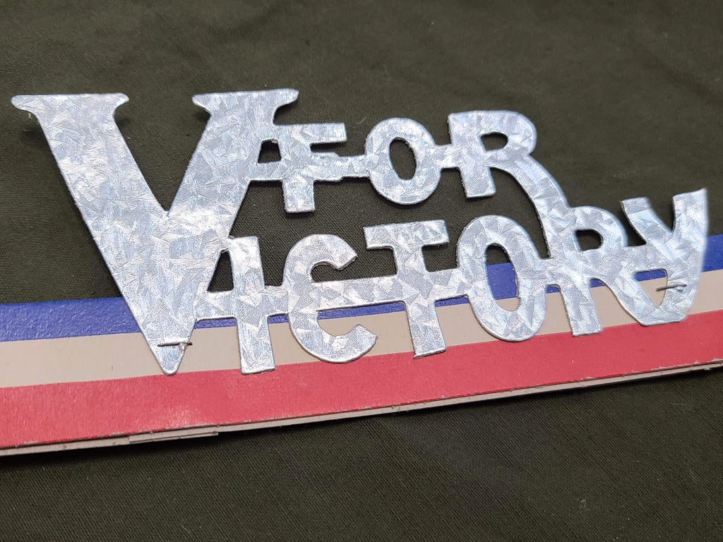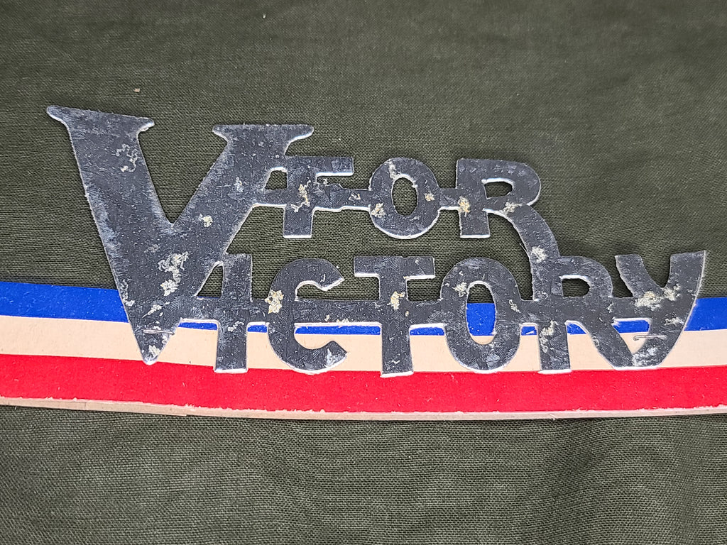 Vintage 1940s WWII V for Victory paper headband. The "V for Victory" is made for a shiny iridescent paper. Made in U.S.A. Decent condition, some light wear and some rust on the staples. It has been stored flat for years and the areas where the sides are creased are showing wear. IT WILL MOST LIKELY RIP IF YOU TRY TO WEAR IT. We have several available. Some have some discoloration spots on the writing. The corner of the V on some shows wear. See photos for condition.