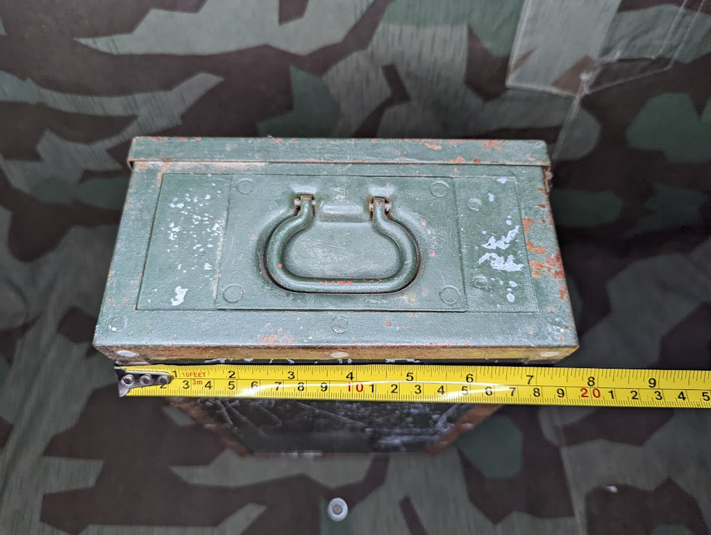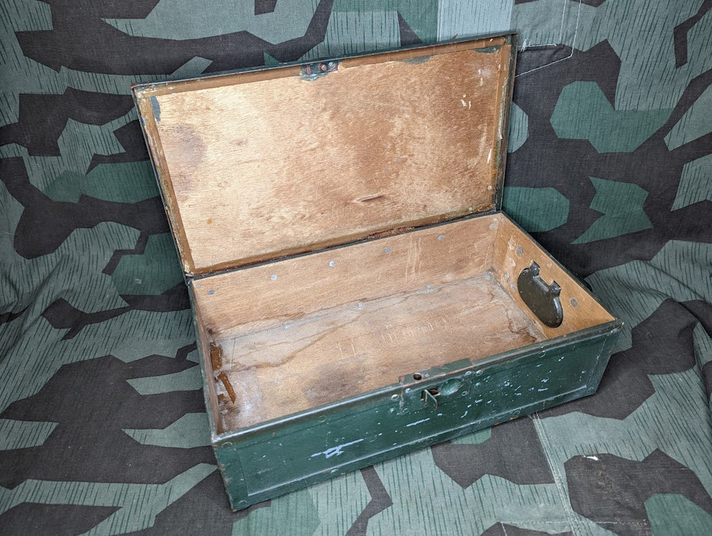Decent verbandkasten type box. Its well worn and used but still very solid. A nice box for smalls. Technically this is camouflaged as the green paint that is on it is the typical color for German field fortifications like those found in Hürtgenwald. - ← Previous Product Next Product →