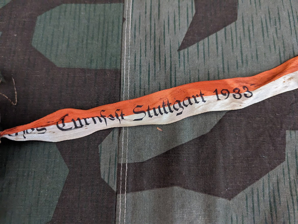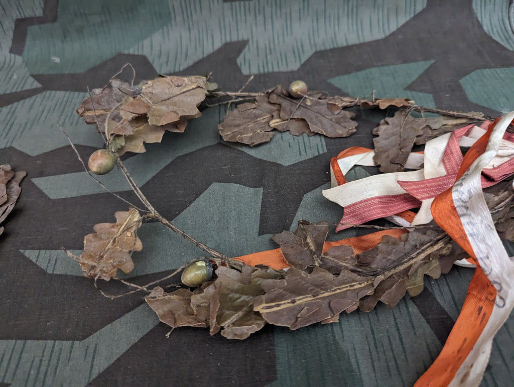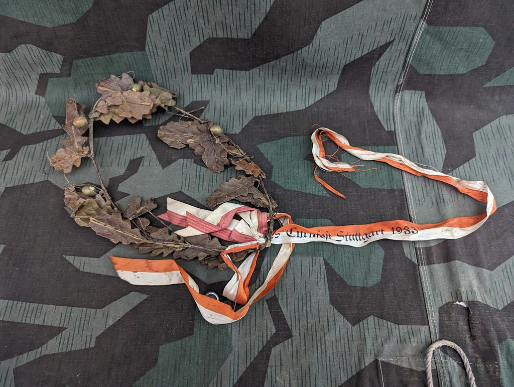 Original sports victory wreath or crown from Turnfest Stuttgart 1933. Made with fake leaves and acorns. It is is somewhat rough condition. I am not sure if is missing some leaves. The cloth bands are tattered and stained. A delicate piece that is lucky to have survived. - ← Previous Product Next Product →