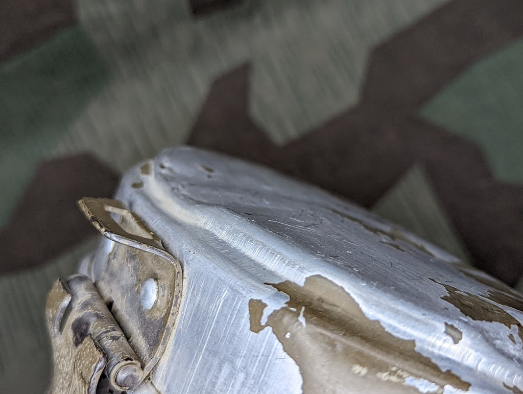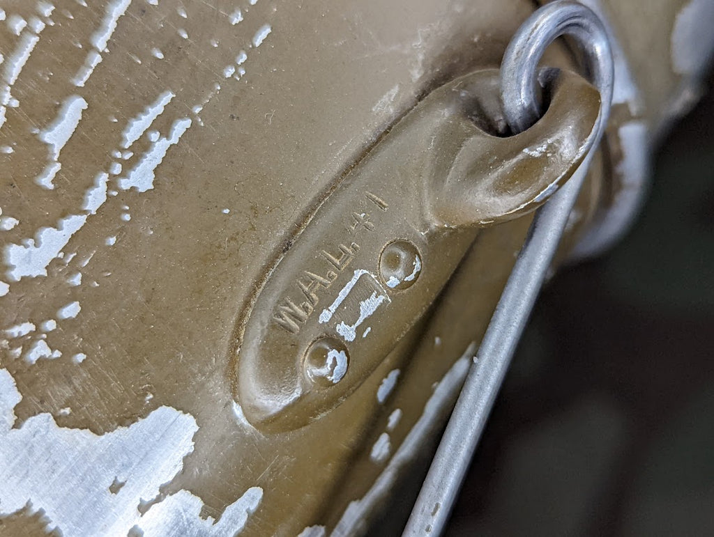 Dented but matching original W.A.L.41 mess kit. It is a little beat up but still quite nice looking and has not been messed with. The paint is original. There is some heavily worn off paint on the handle, which looks like it was intentionally done but after comparing it to some other wear, it seems like that is just how this one wore. The inside is extremely clean. - ← Previous Product Next Product →
