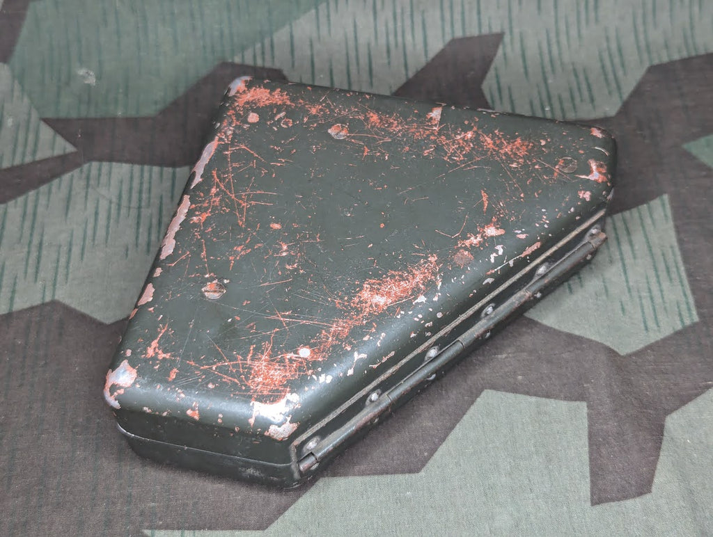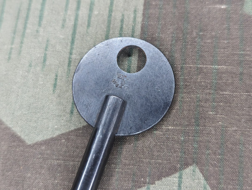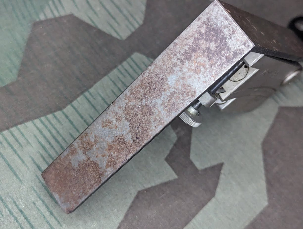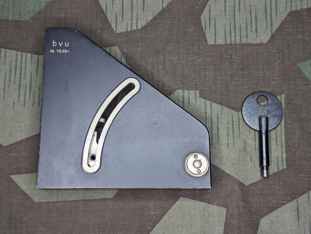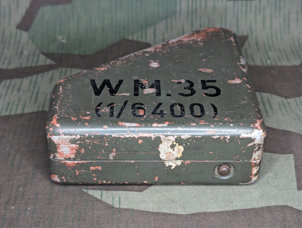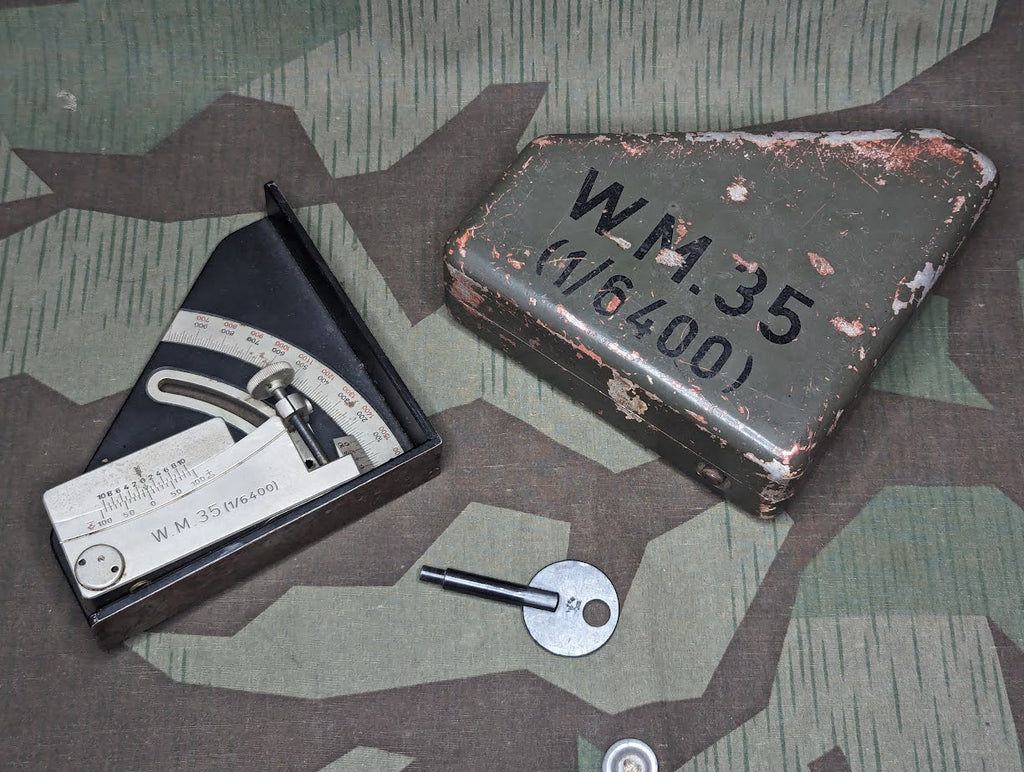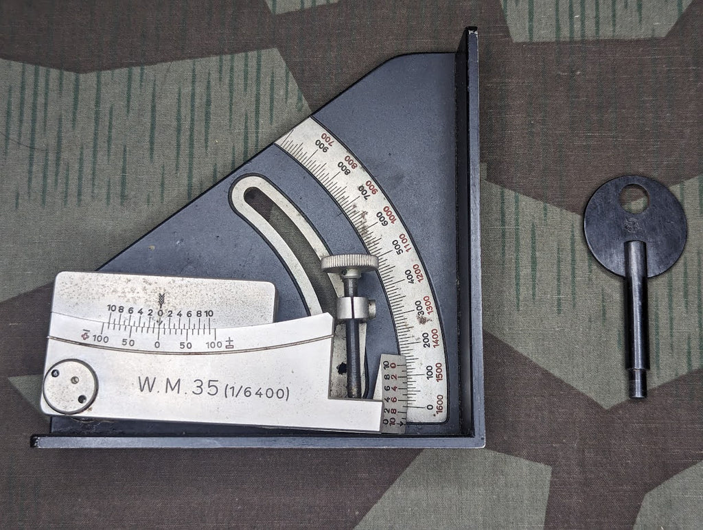 Nice original German artillery and mortar winkelmesser W.M.35 in the original box with the original key. There is always a small flat unpainted area on nearly every piece of German artillery near the breach, that is where this would be placed and clamped down. This would allow you to calibrate the mounting of the sight block. - ← Previous Product Next Product →