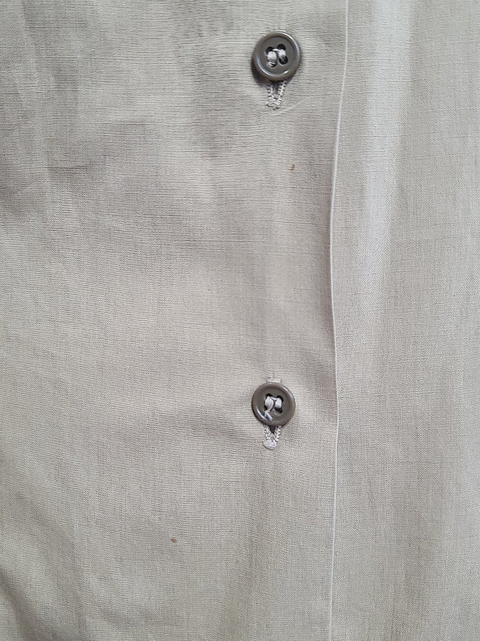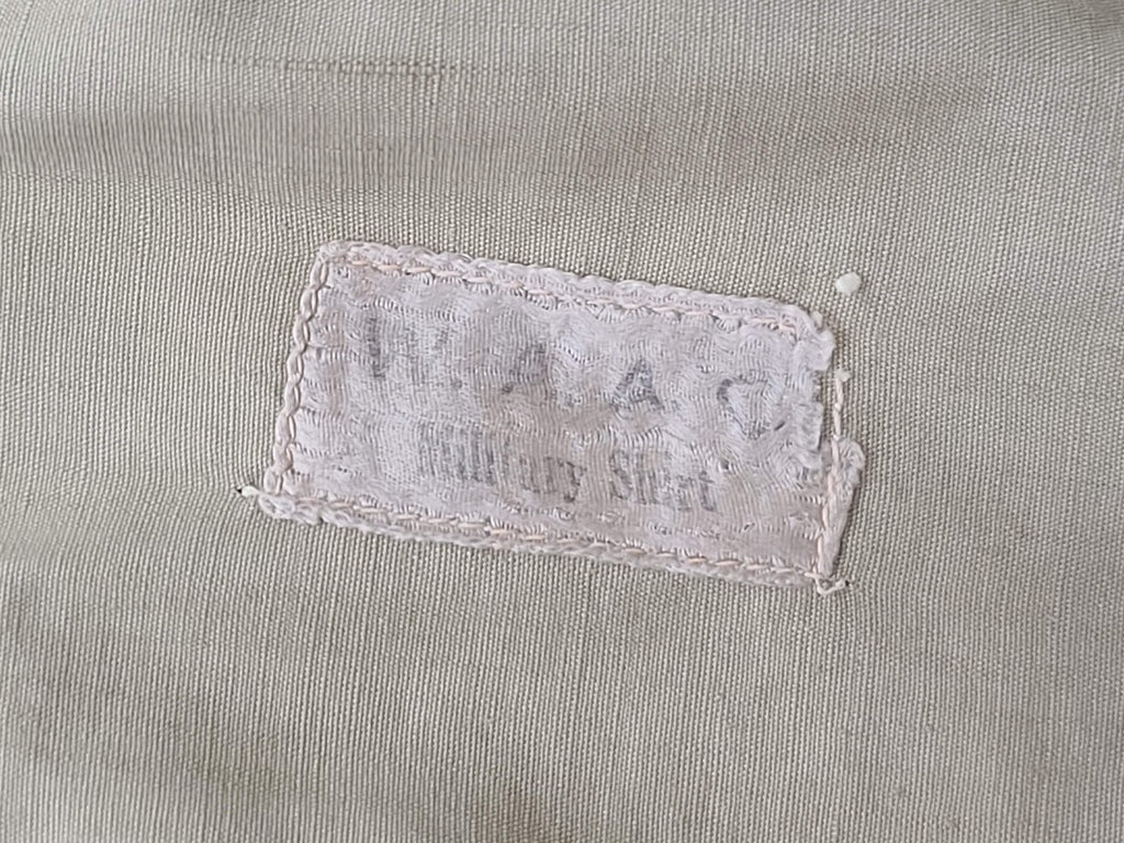 Sleeve (shoulder seam to end of cuff) - 24"Tagged inside "W.A.A.C. Military Shirt" This has the hole in the pocket flap to accommodate a pen. There are a few tiny rust specks. The underarms show some very light discoloration (not very noticeable). No attempt has been made to launder this shirt. The ends of the collar and cuffs of the sleeves show wear. The fabric has worn thin, exposing the white material underneath. The bottom of the shirt has staple holes from where a label (probably from a dry cleaner) was (not visible when worn. Light wear on the neck and the label has some fraying.