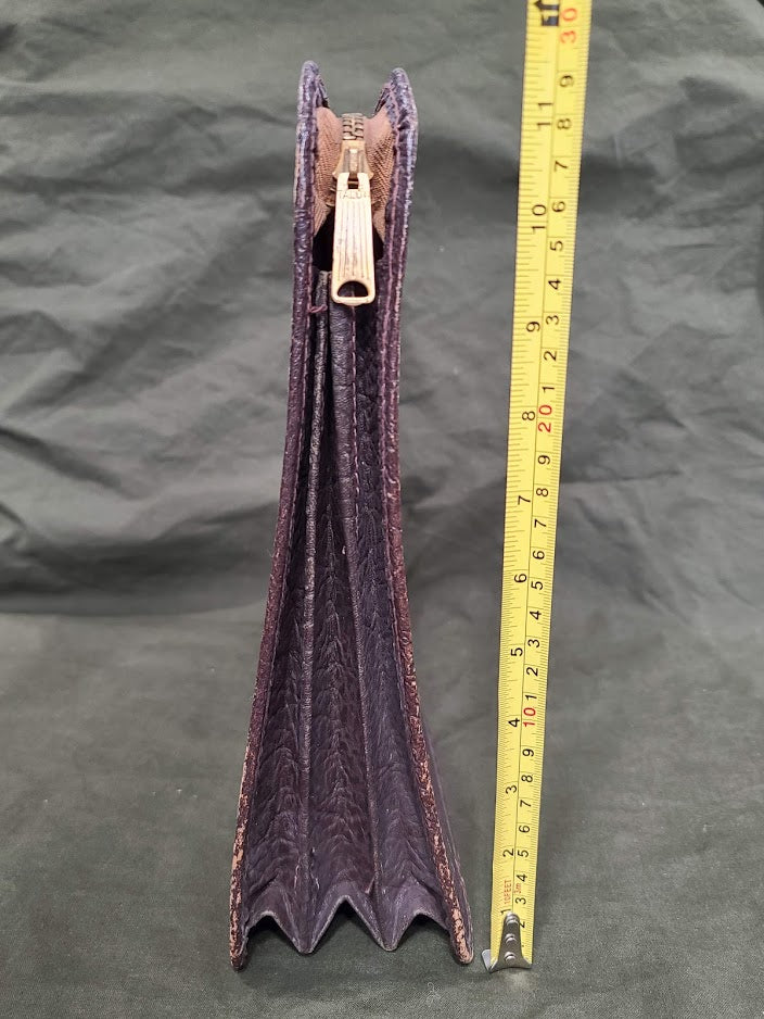 Vintage WWII leather briefcase / document holder that belonged to either a WAC or an army nurse. It is named to Mary Helen Llewellyn (her name is written in pen by the zipper and looks to be followed with a service number). The initials M.H.L. are on the front in gold writing. The handles can be pulled up or pushed down. It is in decent, still usable condition. There is some light wear around the edges. - ← Previous Product Next Product →