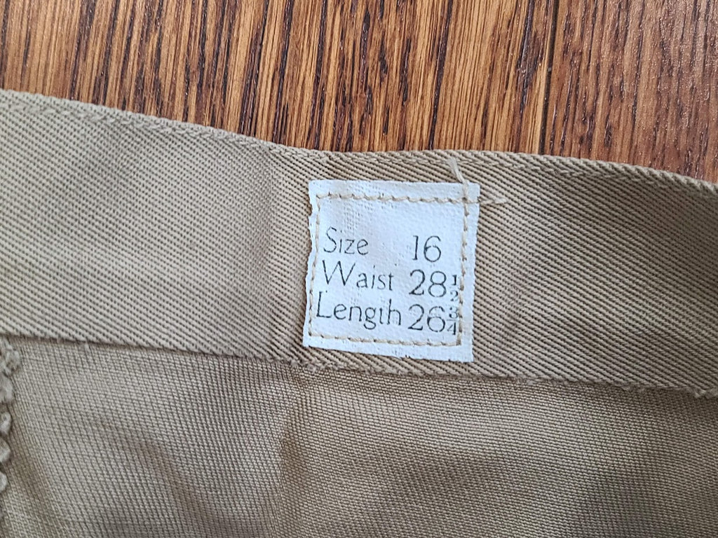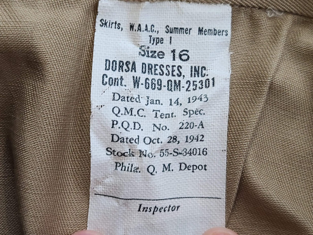Length - 26 1/4"The skirt has nice labels, "Skirts, W.A.A.C., Summer, Members Type 1 Size 16". Dated 1943. The skirt looks unworn. It has been stored folded for quite some time (you can see the indent of the button on the fabric where it was folded over). It has some storage wear and some smudges near the bottom of the skirt. The measurements listed on the tag are larger than what the skirt actually measures - please refer to the above written measurements (perhaps it was mis-measured or maybe it shrunk?). Still a very nice example.