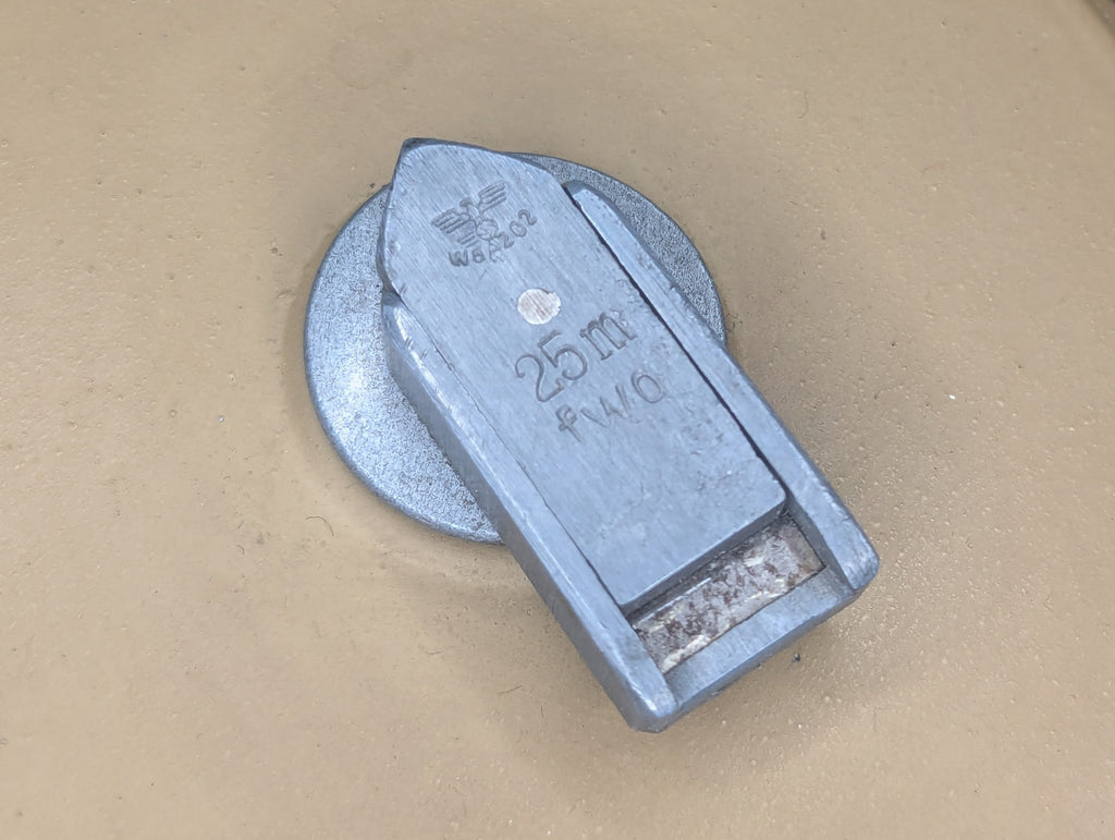 Original 25m steel tape measure. This is a slightly unusual tape measure as it is just the metal case without the leather cover normally found on the early examples of Wehrmacht tape measures. It does make perfect sense that they would have eventually eliminated the leather covers on these, as they are extremely unnecessary and a waste of leather.