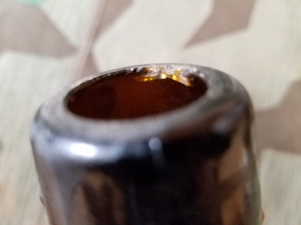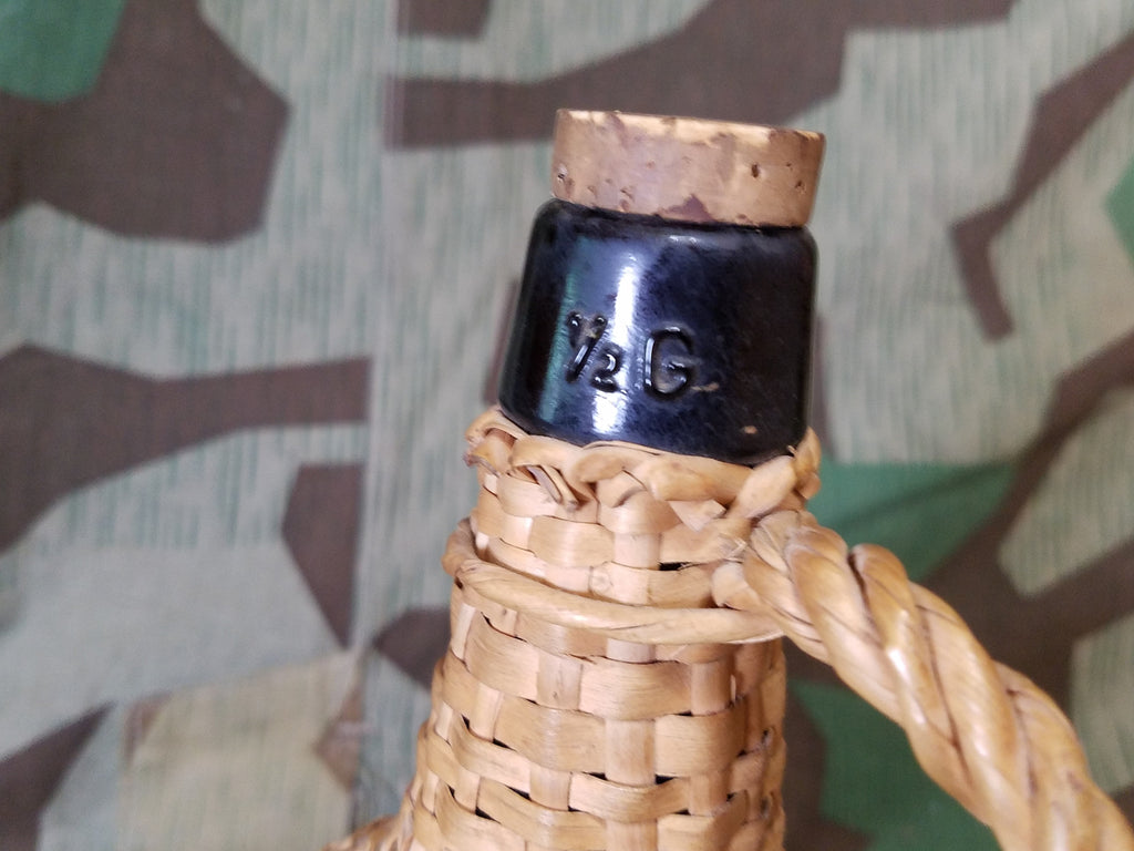 This is a great period rations item that would have been commonly found in many European armies. The jug and wicker are in good condition overall, but there is a small chip in the mouth of the bottle. With a little cleaning, it could still be used at an event to serve up some "water". Jugs like this are seen very often in photos of Germans unloading supplies from a truck. It measures approximately 12 1/2" tall and the bottom is a little over 4 1/4" in diameter. Made in Portugal and it does have US writing on the bottom. - ← Previous Product Next Product →