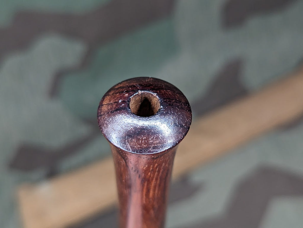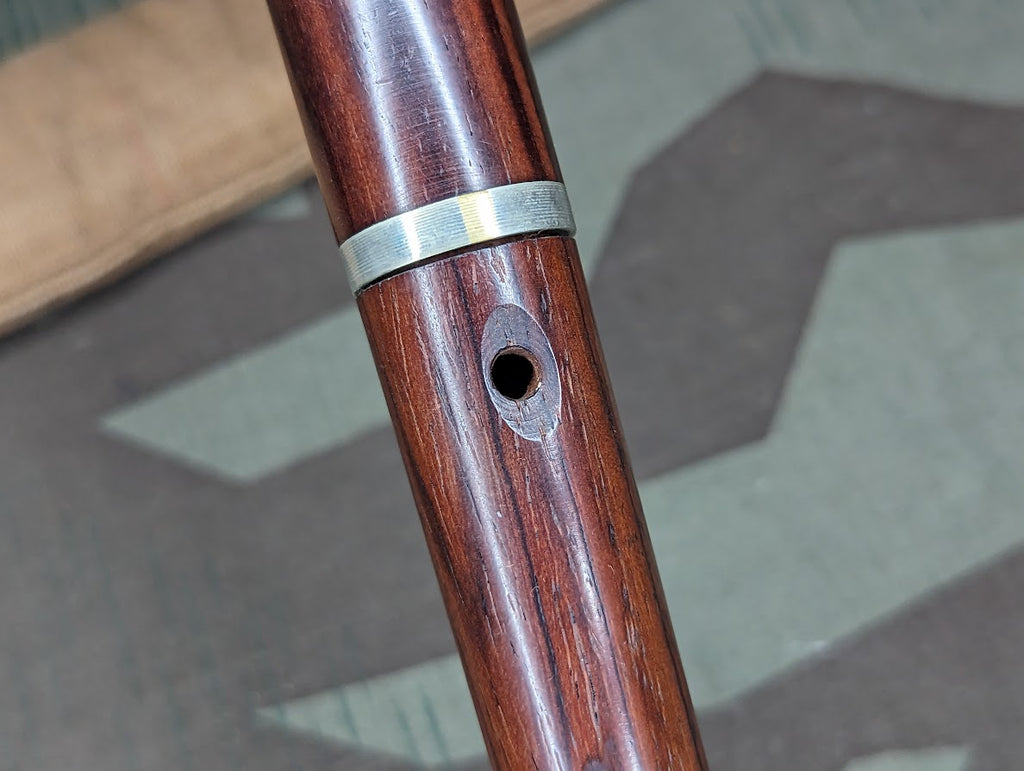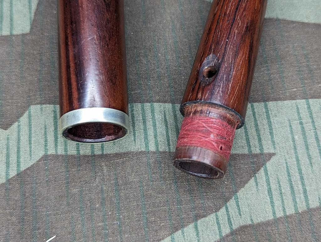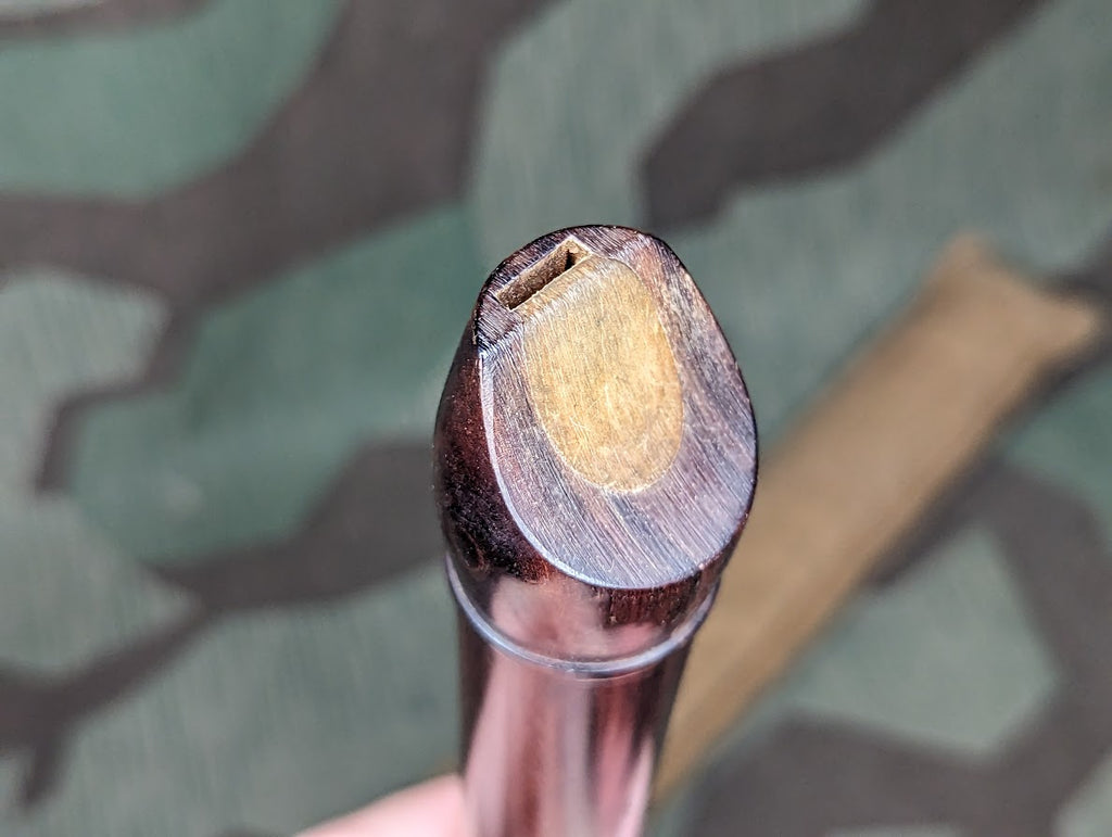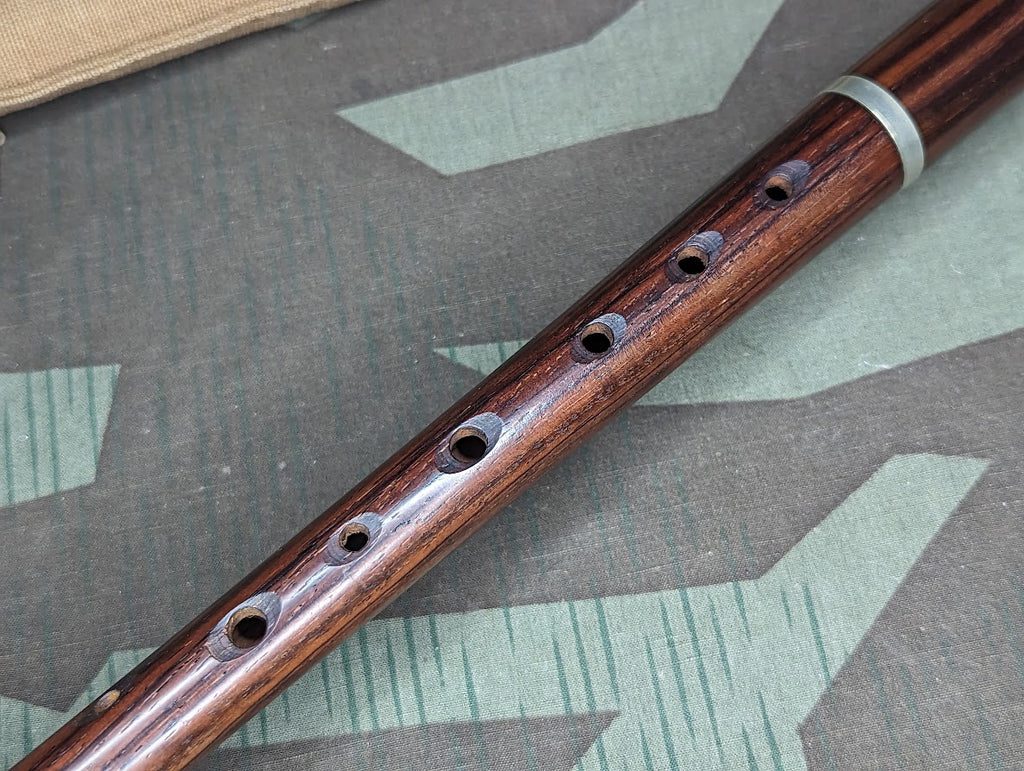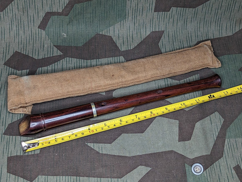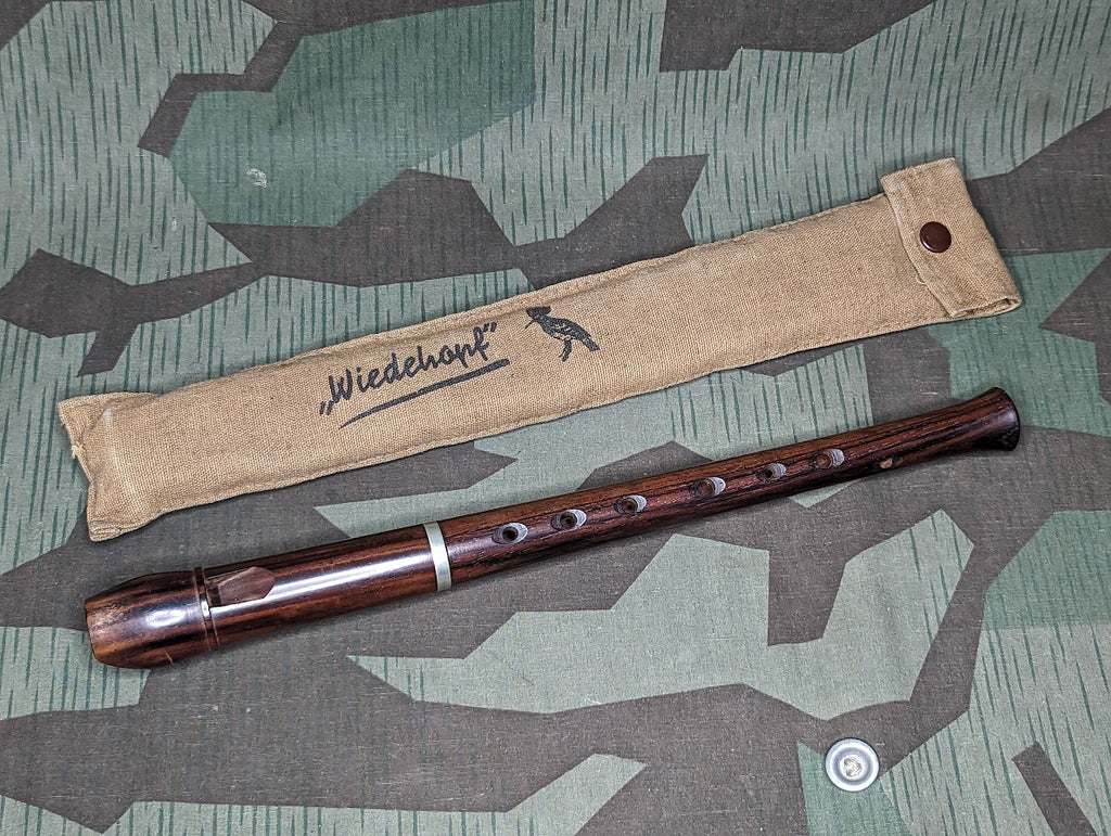 Nice German wooden recorder in its original pouch. Instruments are not something I know a great deal about as far as dating them goes, but this certainly seems prewar. The cloth pouch shares a lot of similarities with other items from the 1920s-1930s. It also shares a lot of similarities with HJ fifes. It seem to be in good working condition although I do not recall my elementary school days well enough to produce a recognizable tune. The mouthpiece seems pretty clean and decent, and not gnawed on by some teething little HJ kid. - ← Previous Product Next Product →
