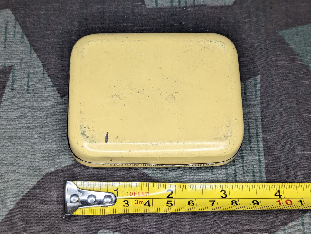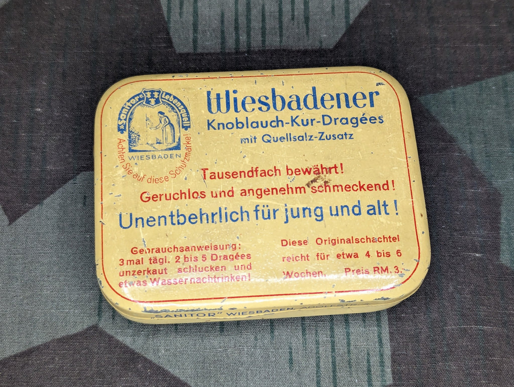 Nice Wiesbadener garlic pill tin. It does have some light wear. Price is in RM (reichsmarks). Cure tablets - proven a thousand times over for young and old! Directions say to take 2-5 tablets 3 times a day and drink lots of water. Clean inside.