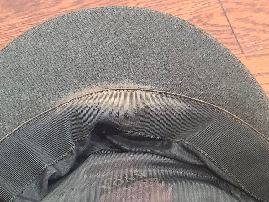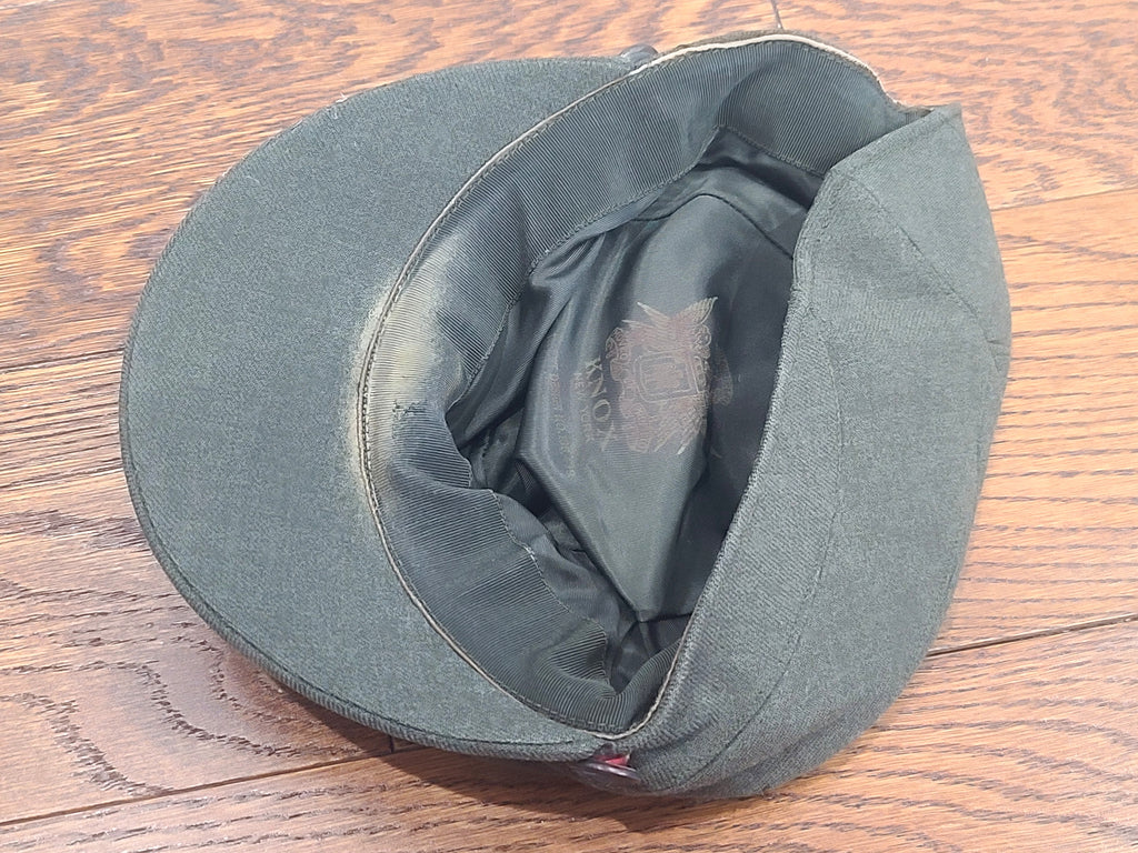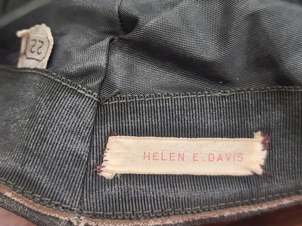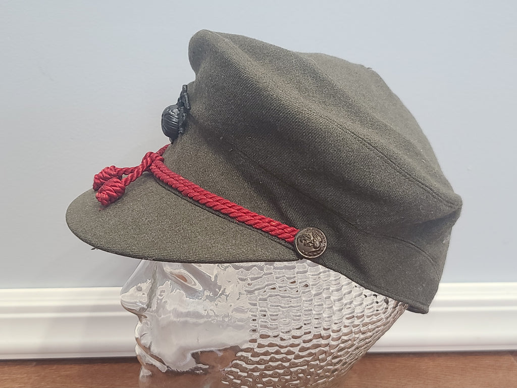 Original WWII women's Marine Corps (USMCWR) winter service hat. Named to Helen E. Davis. Size tag 22 (it actually measures closer to 21 and could use a hat stretcher to shape it - however Marines stored their hats, it always seems to have made them shrink a size). The stitching holding the red trim on the hat is coming loose. There is some wear along the edges and on the red trim. Small hole on the side (not too detracting). Some wear on the sweatband inside. Knox logo inside. The hat was stored improperly and needs reshaped.