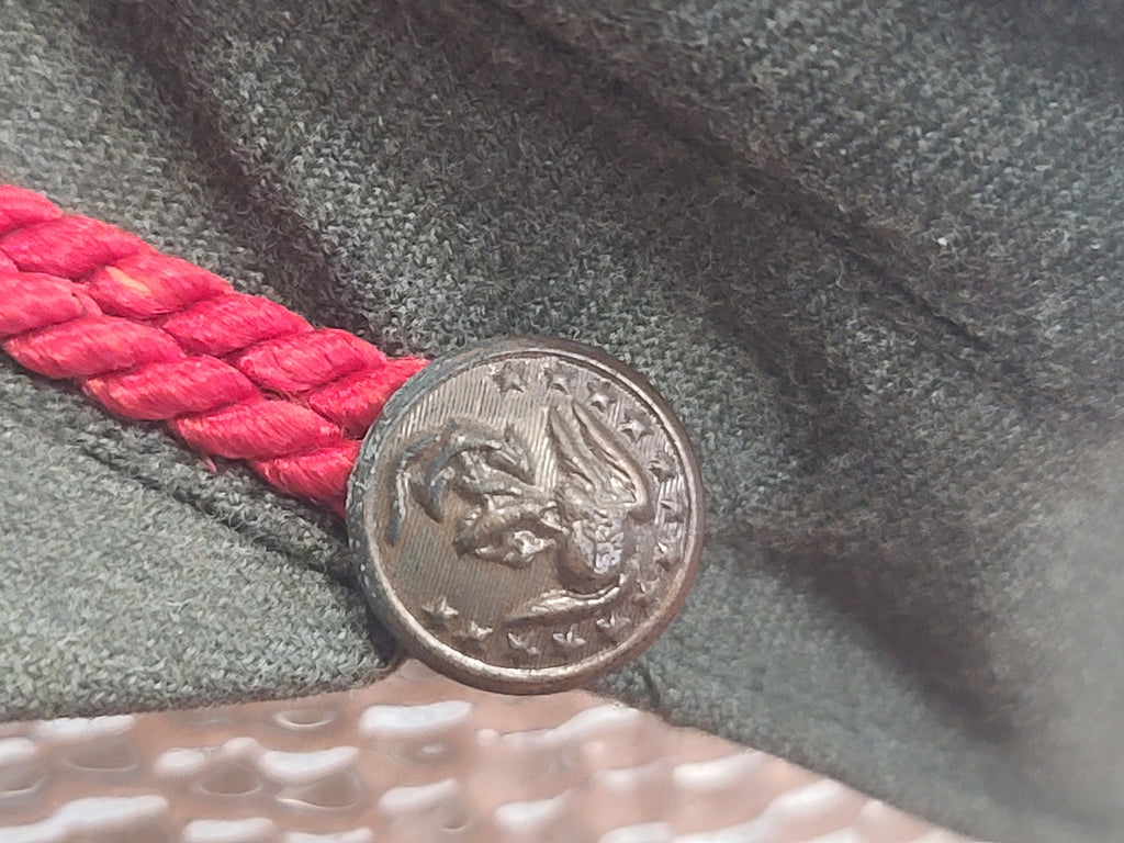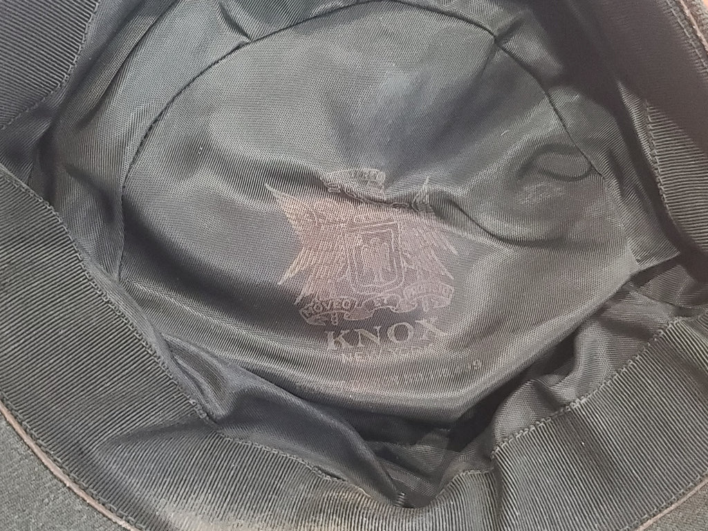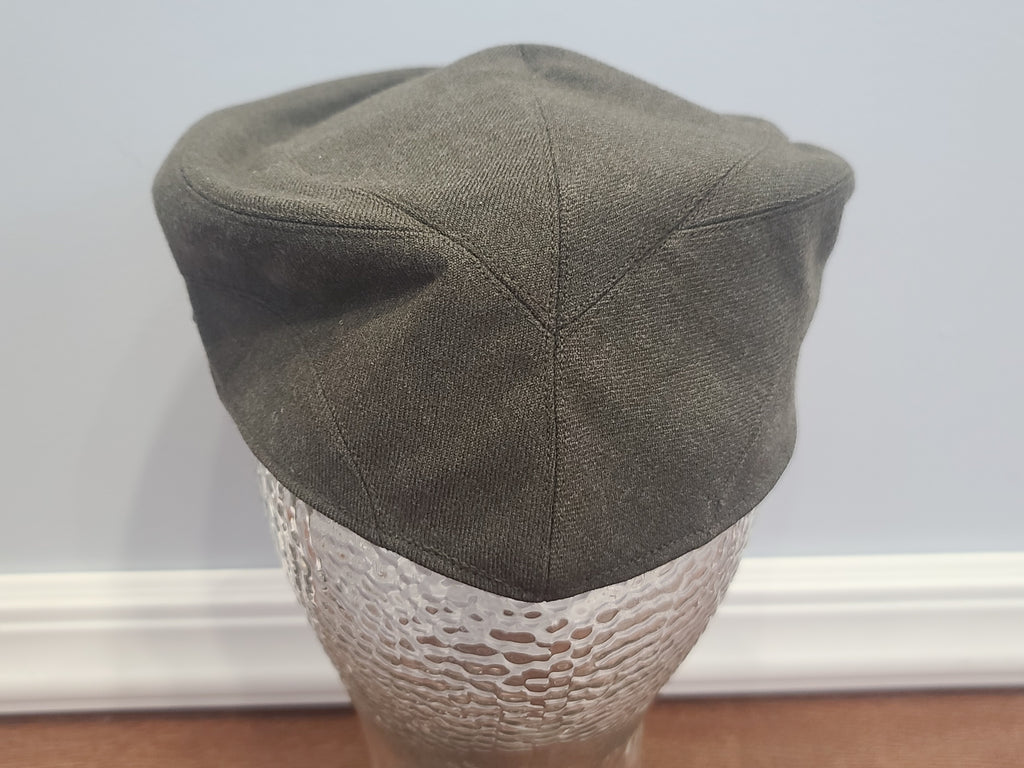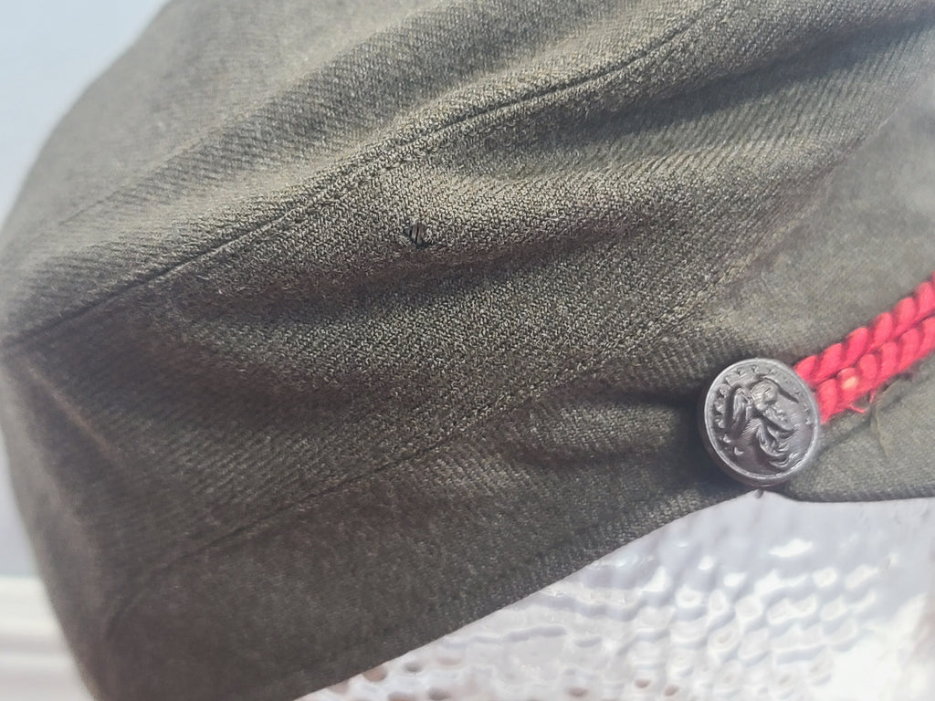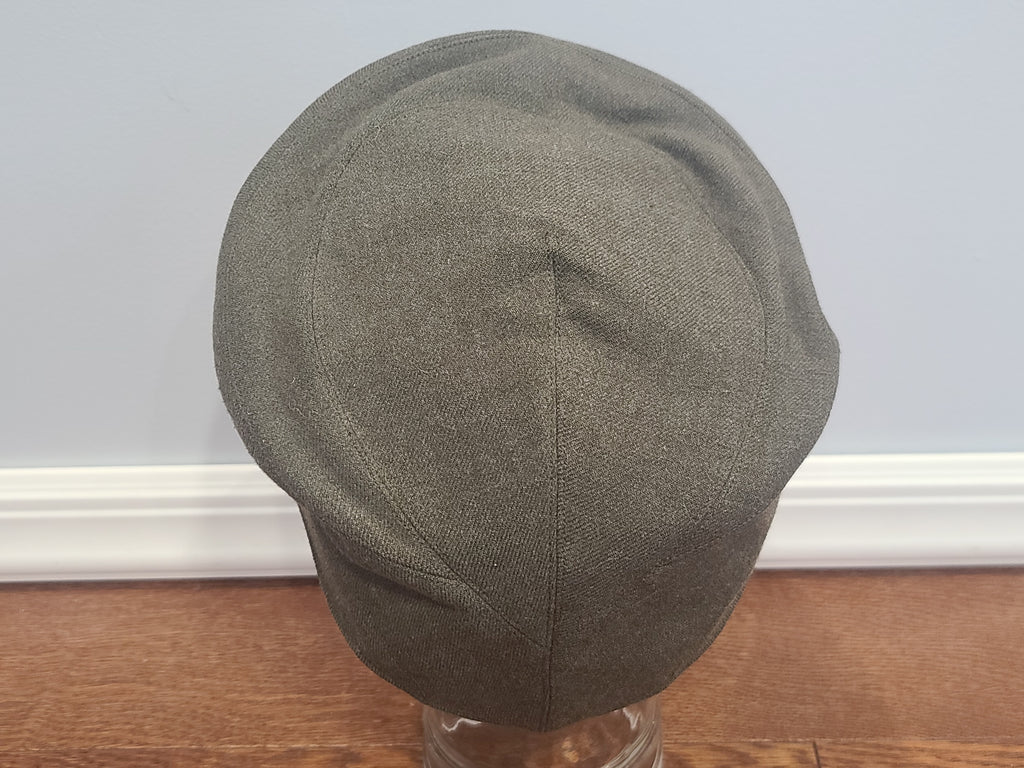 Original WWII women's Marine Corps (USMCWR) winter service hat. Named to Helen E. Davis. Size tag 22 (it actually measures closer to 21 and could use a hat stretcher to shape it - however Marines stored their hats, it always seems to have made them shrink a size). The stitching holding the red trim on the hat is coming loose. There is some wear along the edges and on the red trim. Small hole on the side (not too detracting). Some wear on the sweatband inside. Knox logo inside. The hat was stored improperly and needs reshaped.