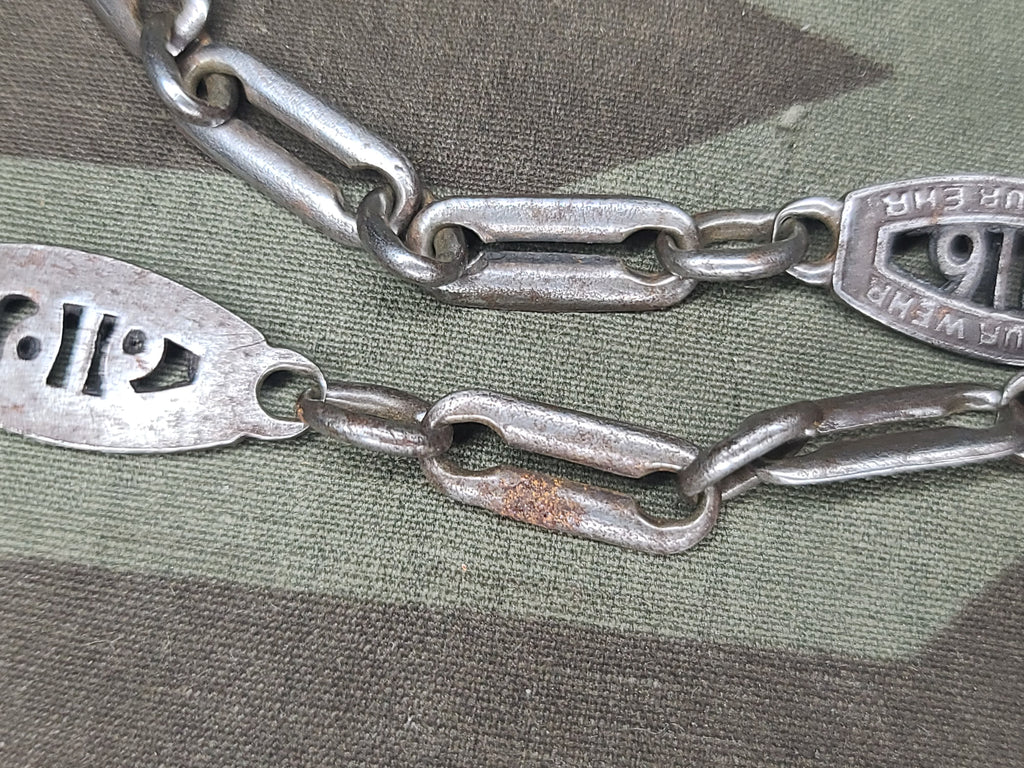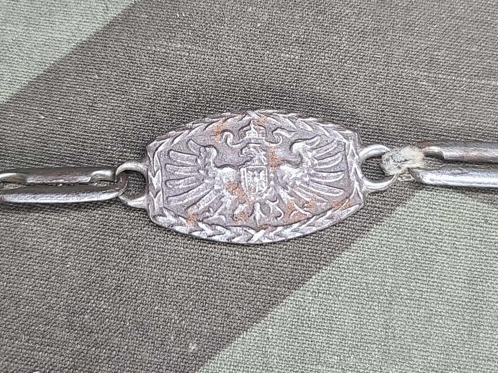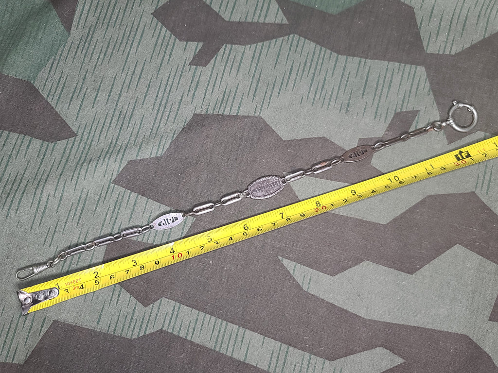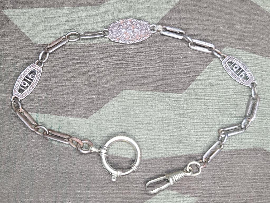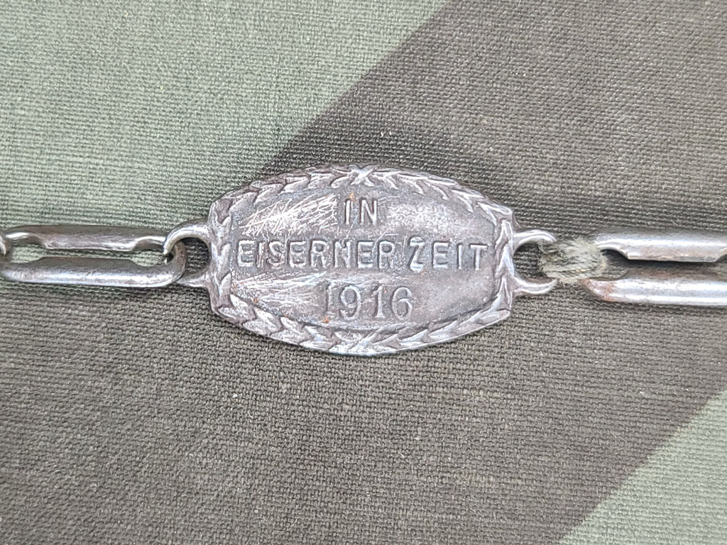 WWI In Eisener Zeit 1916 watch chain. Gold zur Wehr - Eisen zur Ehr, gold for weapons, iron for honor. Items like this would be used to replace donated items for the war effort, a very patriotic item and quite practical. It does have some rust and general wear. One of the links has been replaced by thread, but it is still holding together, even after all these years.