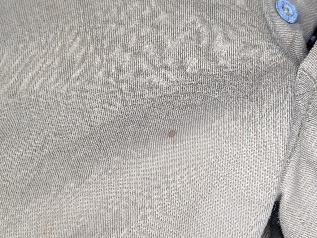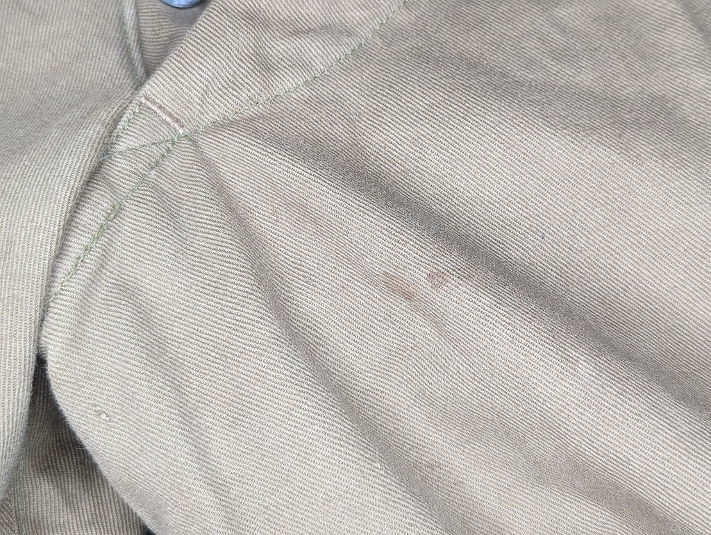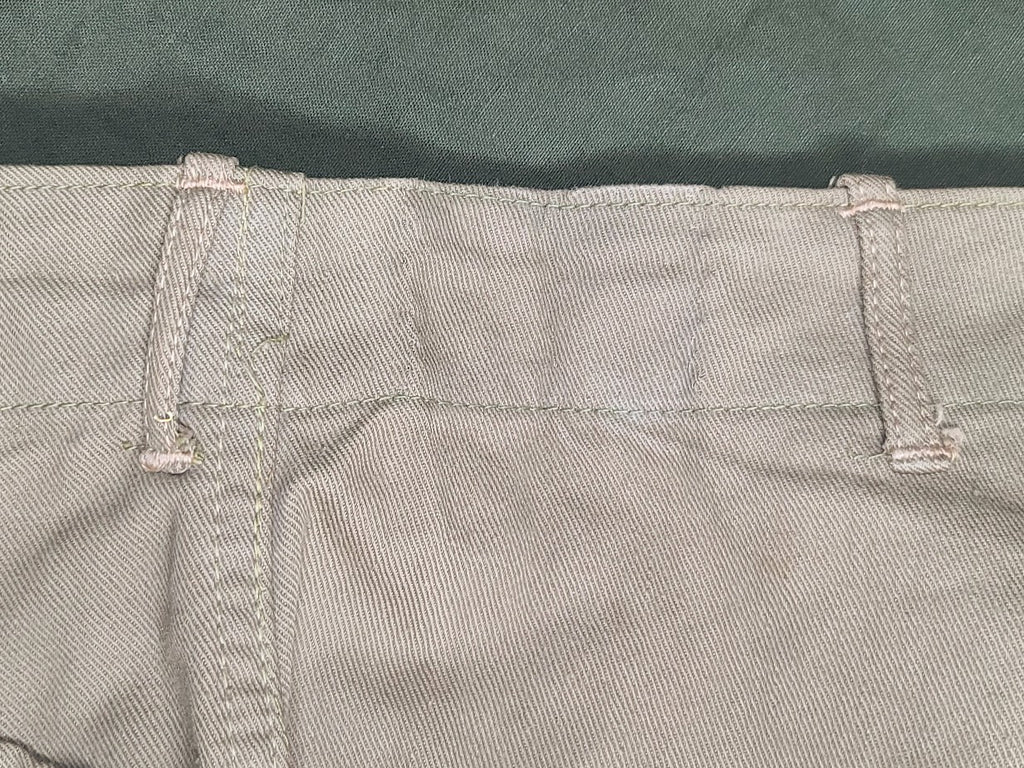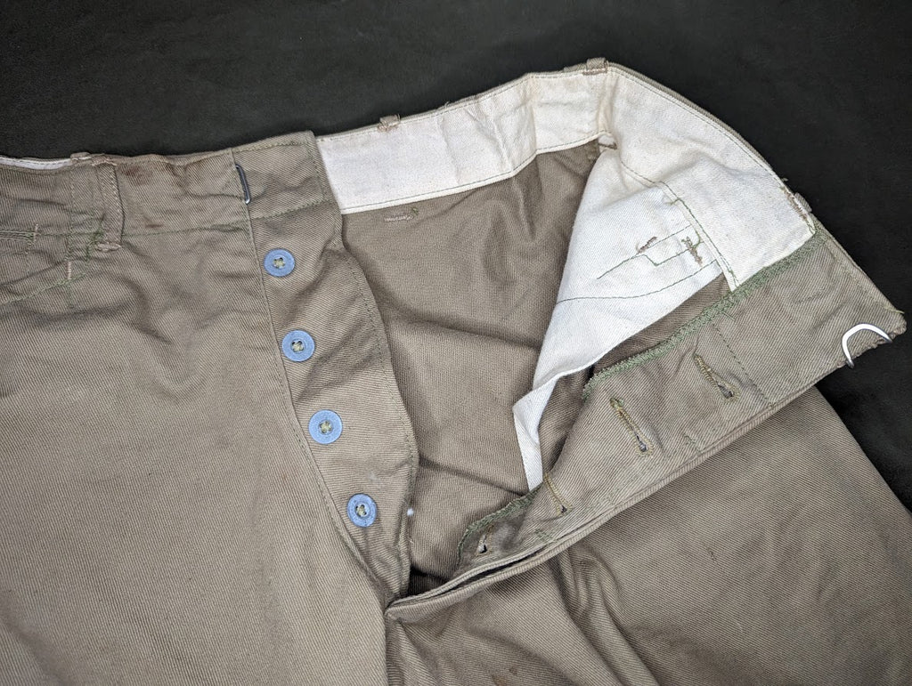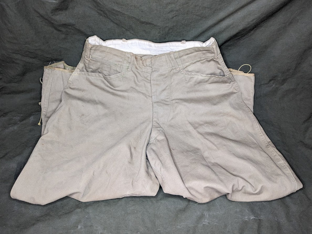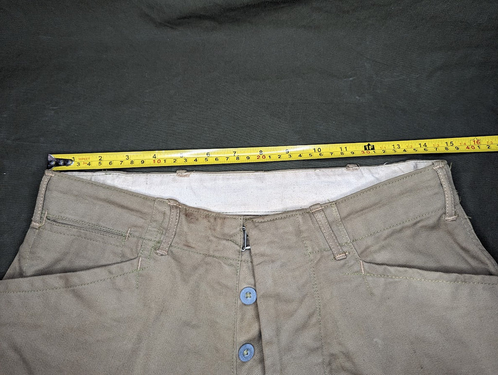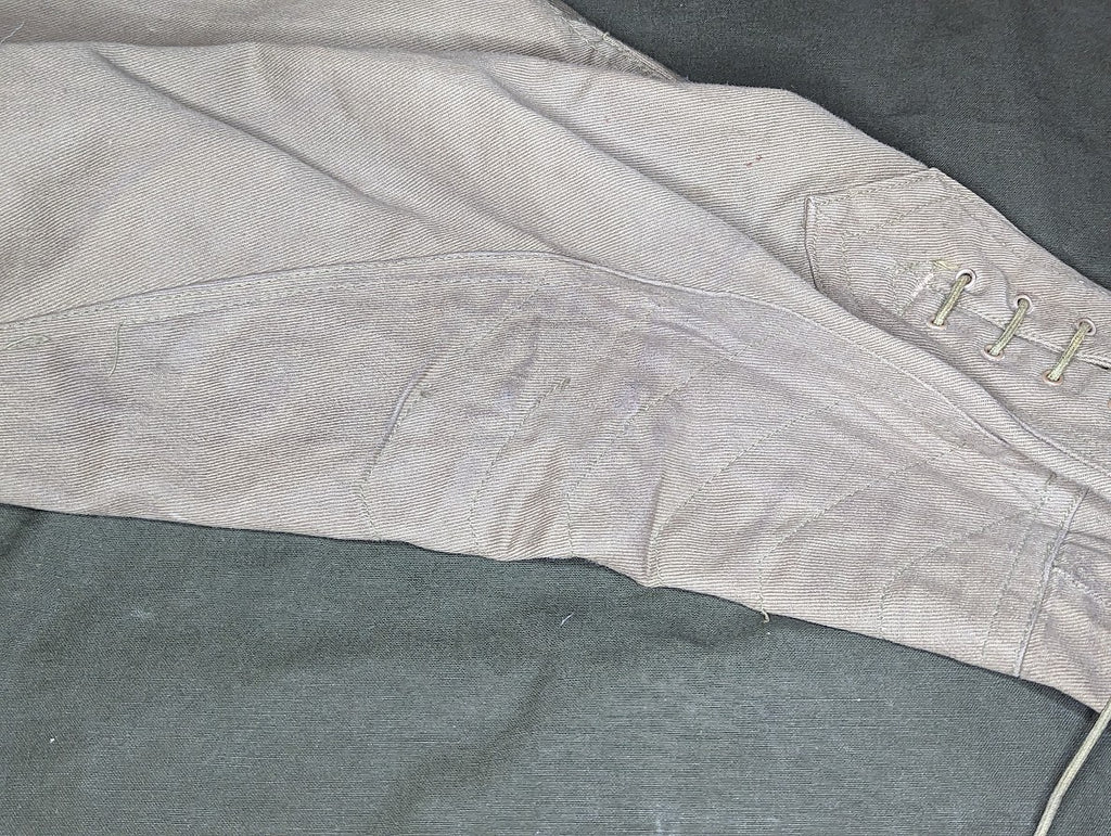 Original WWI US cotton twill breeches. Nice label on the inside pocket. Dated April 18 1917. There are some small stains and some signs of light use. The waist was taken in at some point and has been let back out to the original size (you can still see where the stitching was). The waist is about 30". - ← Previous Product Next Product →