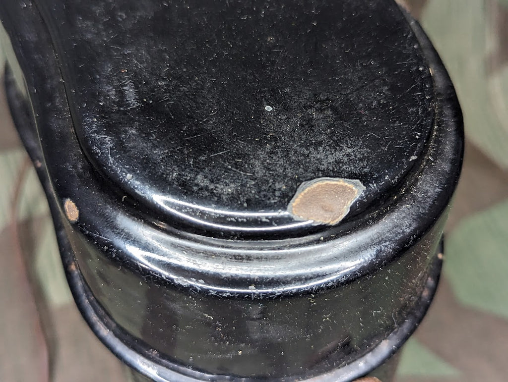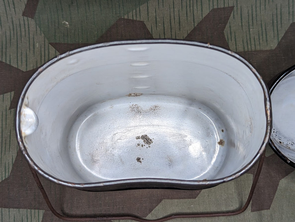 A very nice example of the enameled WWI mess kit. It has a few small chips, but it is one of the nicest examples I have seen in a long while. It is unmarked. These would have been ink stamped, but that has worn away. - ← Previous Product Next Product →