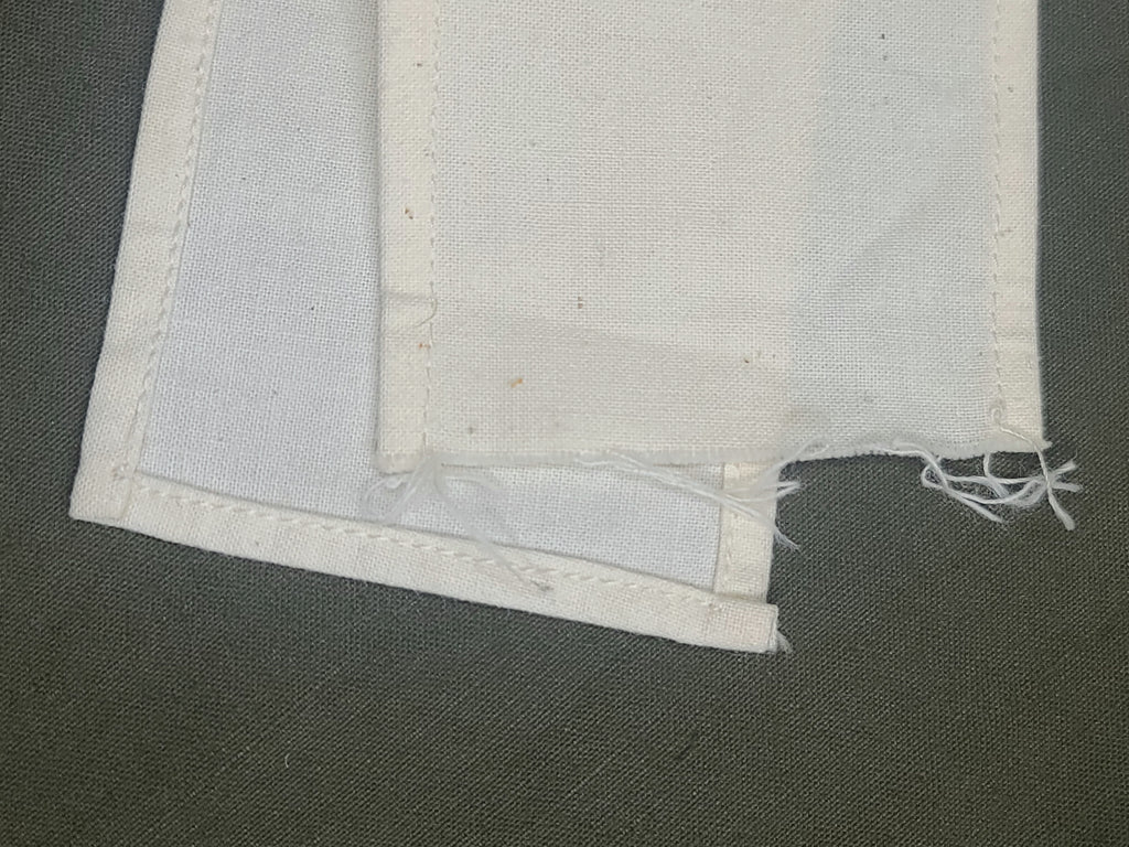 It is made of a lightweight cotton(?) material with felt. One end is finished and the other is not. Overall good condition, but there is a small moth nibble on the felt cross.