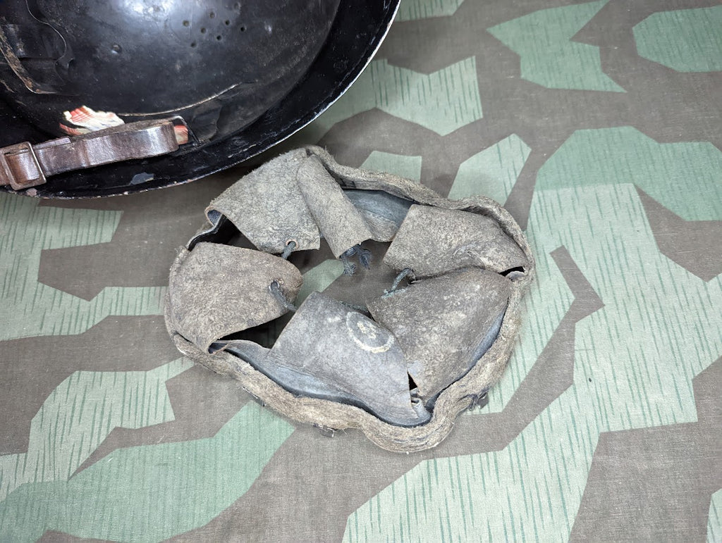 A decent example of a Belgian Gendarmerie helmet. The liner and chin strap are original and there is a paper name tag inside. Now you can own Robert Le Groote's helmet. It has several layers of paint on it, but all appear to be black with the base coat looking like it was either black or an extremely dark gray. The liner is a size 58 and it is in fairly good condition. It is missing one of the small metal hooks which mounts it to the helmet. It still has more than enough grip to stay attached. - ← Previous Product Next Product →