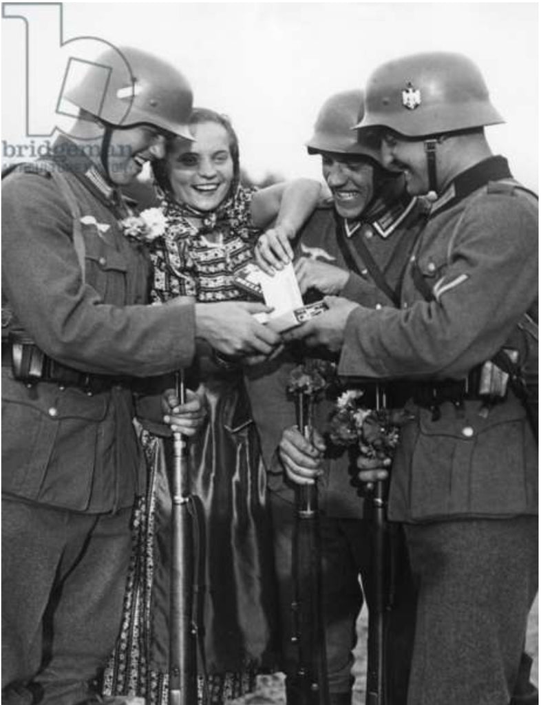 I have not been able to confidently verify the Anschluss / Sudetenland story which was attributed to these. It does seem very fitting and the color scheme is clearly something intended to reflect national colors rather than nature. I have attached some photos of young ladies tucking flowers into soldiers pockets that I found online, but these pictures don't show the flowers clearly enough.