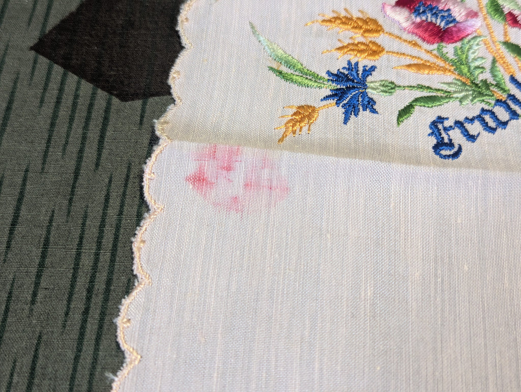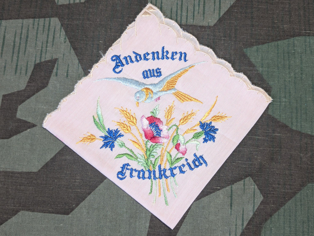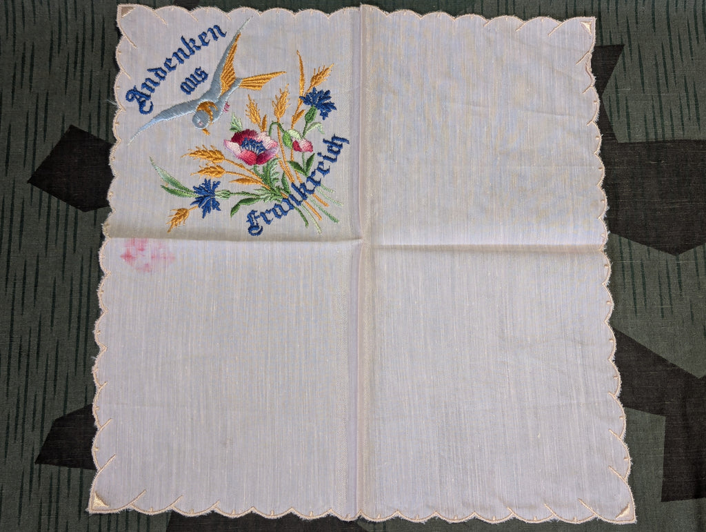 Interesting "Andenken aus Frankreich" German souvenir handkerchief from France. In good condition with what looks a bit like a lip stick stain.