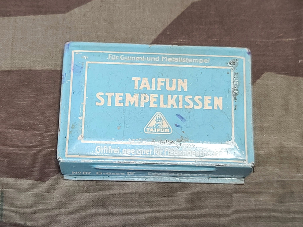 Original prewar or wartime Taifun stempelkissen metal stamp pad. The bottom says it is black ink but it clearly looks like its been used for blue or purple ink. Small size. The lid says it is non-toxic and suitable for meat inspectors. The ink pad is mostly dried up. OK condition outside, the inside is a bit rusty and gross.