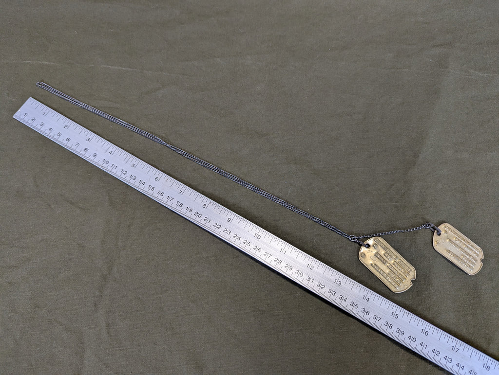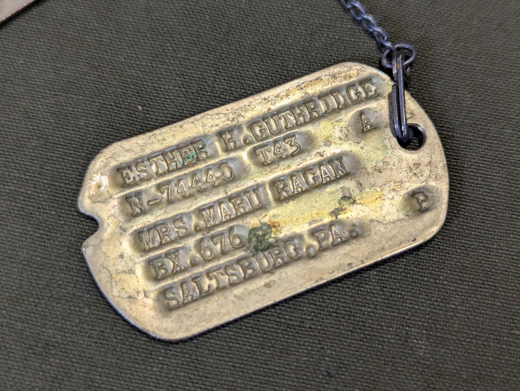 Original set of dog tags belonging to army nurse Esther H. Guthridge on the chain. They show quite a bit of wear. They look like they were gold plated at one time, but most of that has worn off.