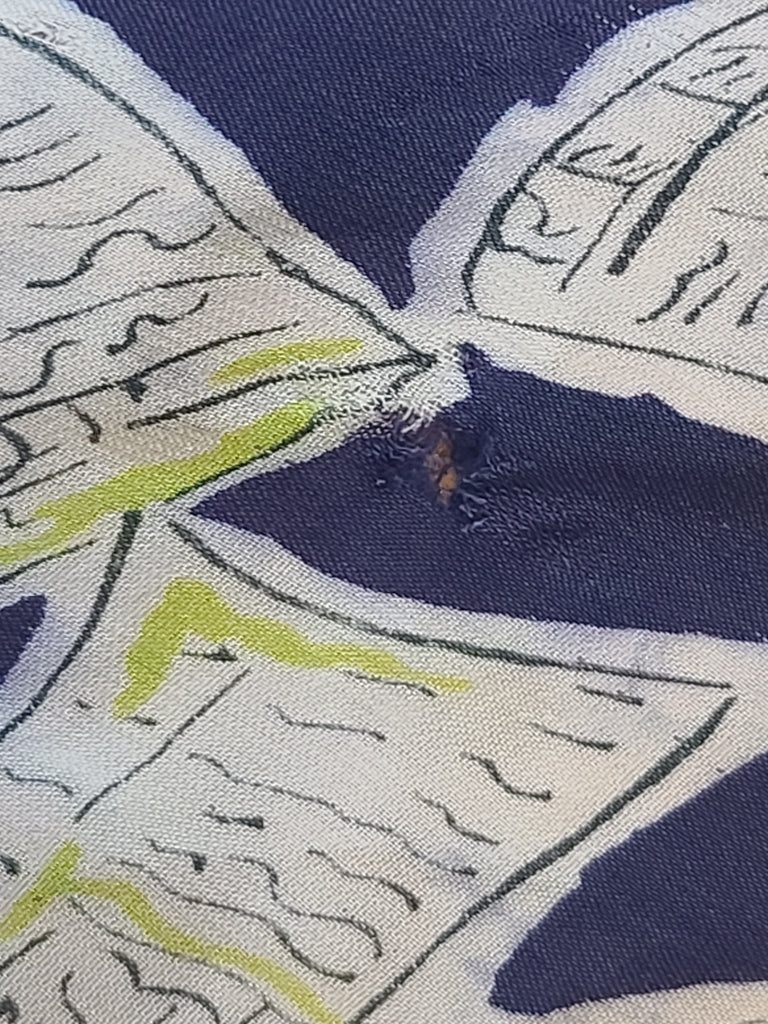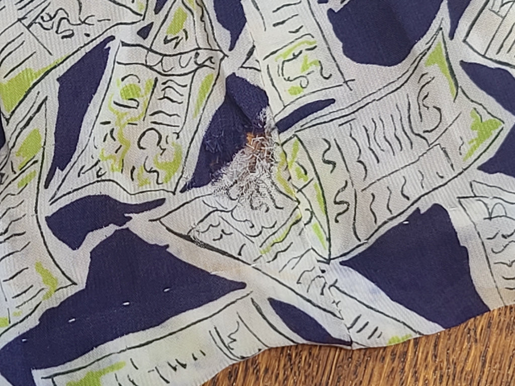 Lightweight see-through material (it will need a slip worn underneath). The material feels quite delicate. AS-IS. There is some staining and color fade throughout. The underarms have the worst of it. The color fade is throughout the pattern. Light brown staining is most noticeable on one side of the chest, the back, the collar and the ends of the sleeves. A few scattered small holes. Some stress on some seams. The inside seams have a lot of loose strings.