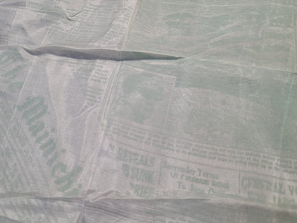 Original silk Pacific Star and Stripes newspaper print hankie. The headlines are for V-J Day and the headline is Japan's unconditional surrender. Overall fairly good condition. It is a little wrinkled. The print is light green and can be hard to read depending on the angle.