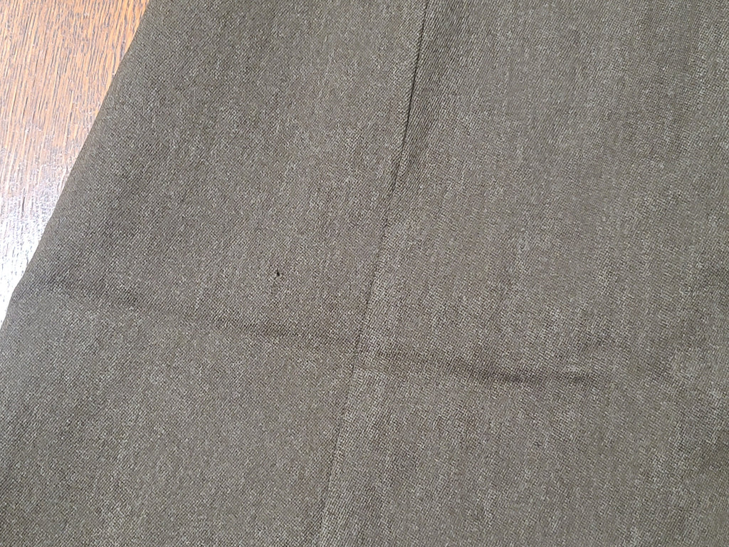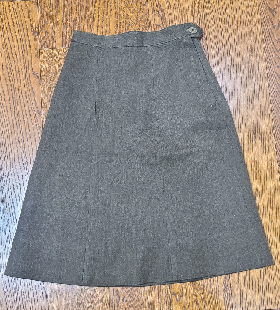 Original skirt. I see this material most on enlisted WAC uniforms. Metal Serval zipper. Marked size 12 but it seems to be quite a bit smaller than that. It is also rather short (the hem has ~3" of material, so it could be let down a little, but even then it would still be on the short side).